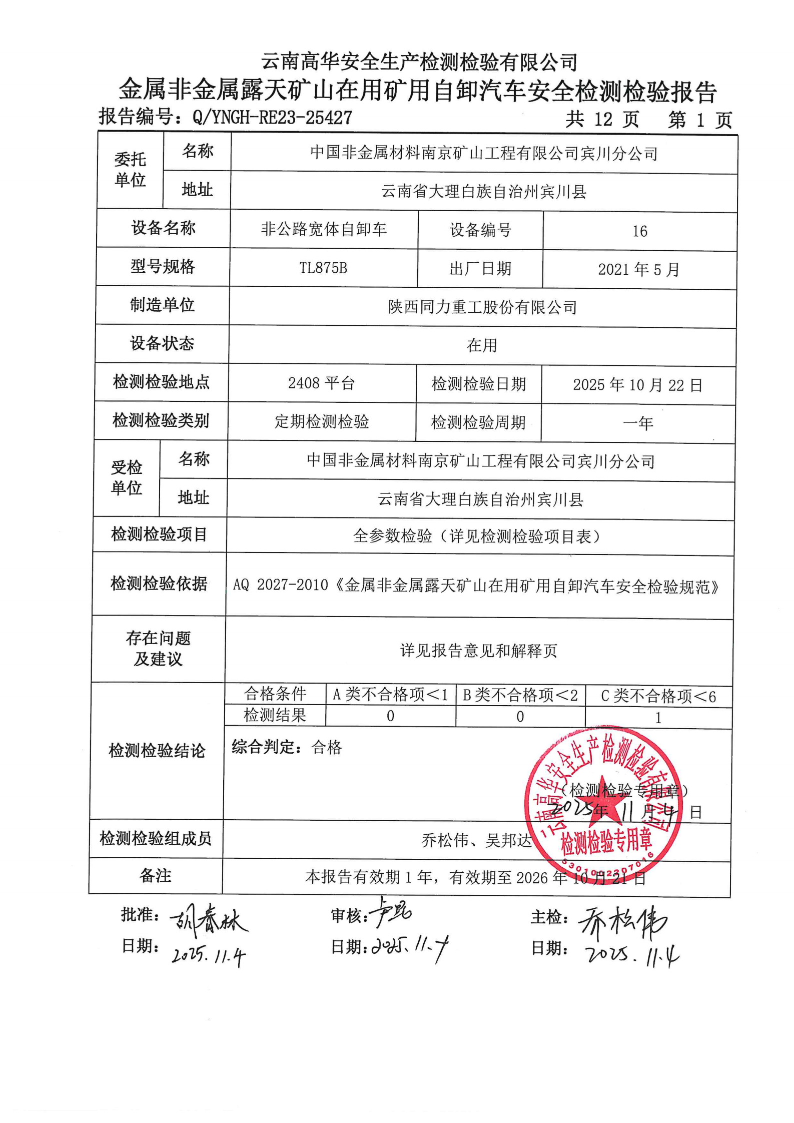 金属非金属露天矿山在用矿用自卸汽车安全检测检验报告