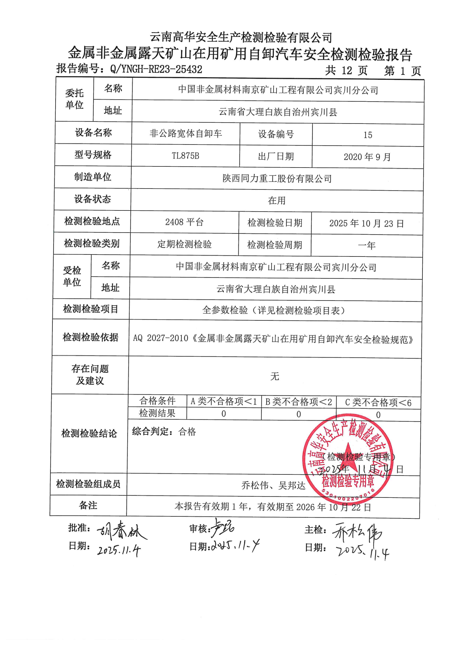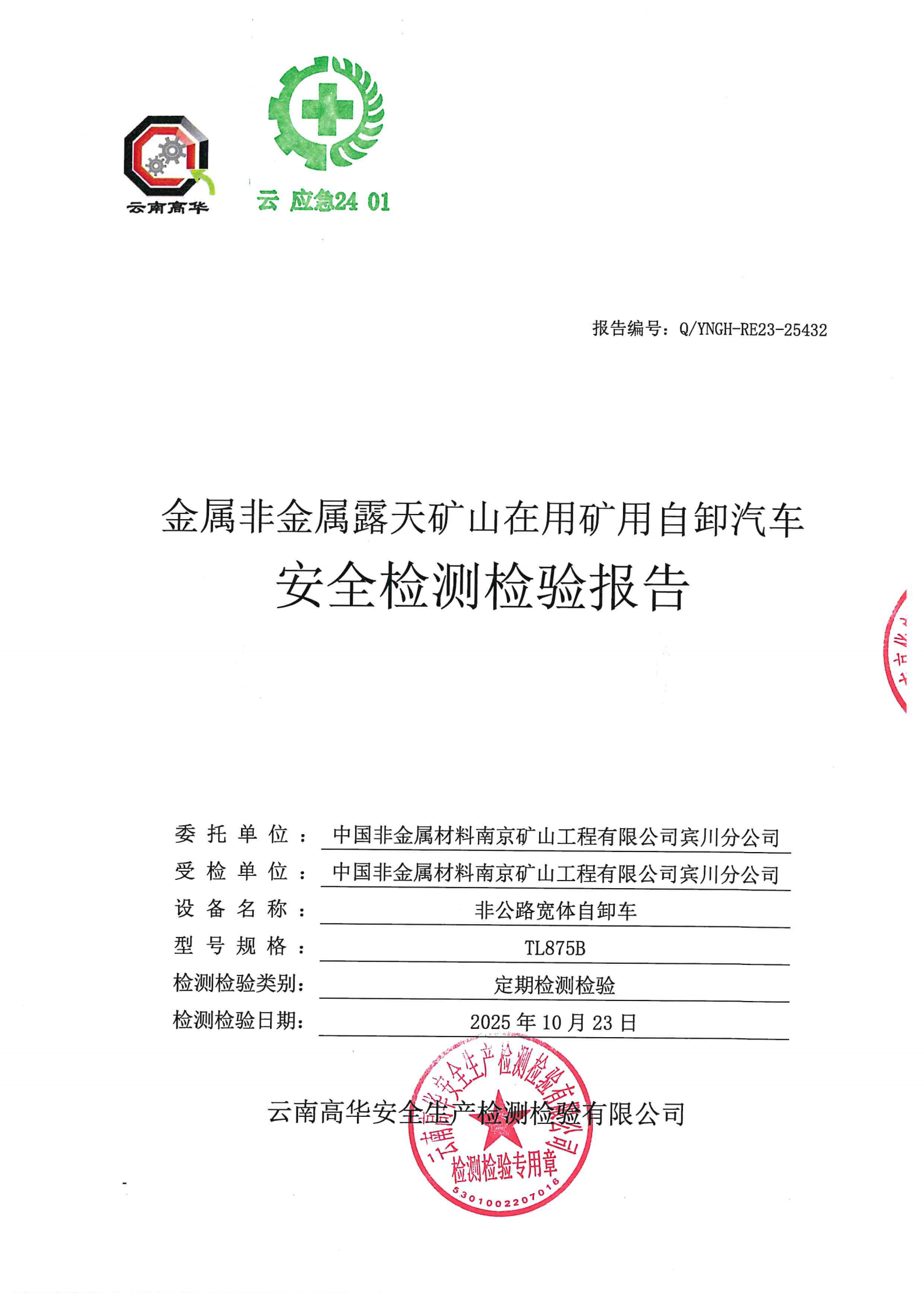 金属非金属露天矿山在用矿用自卸汽车安全检测检验报告
