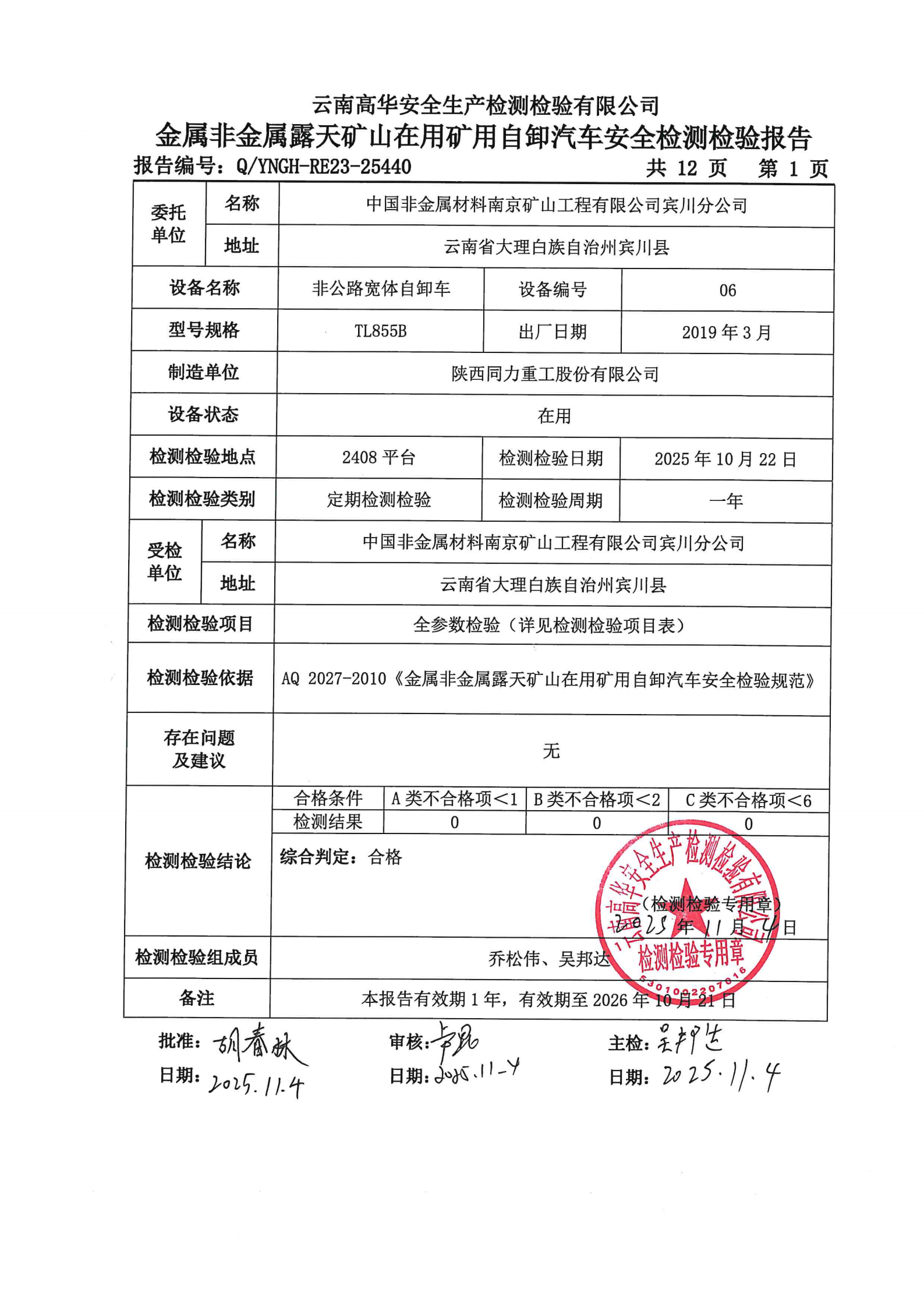 金属非金属露天矿山在用矿用自卸汽车安全检测检验报告