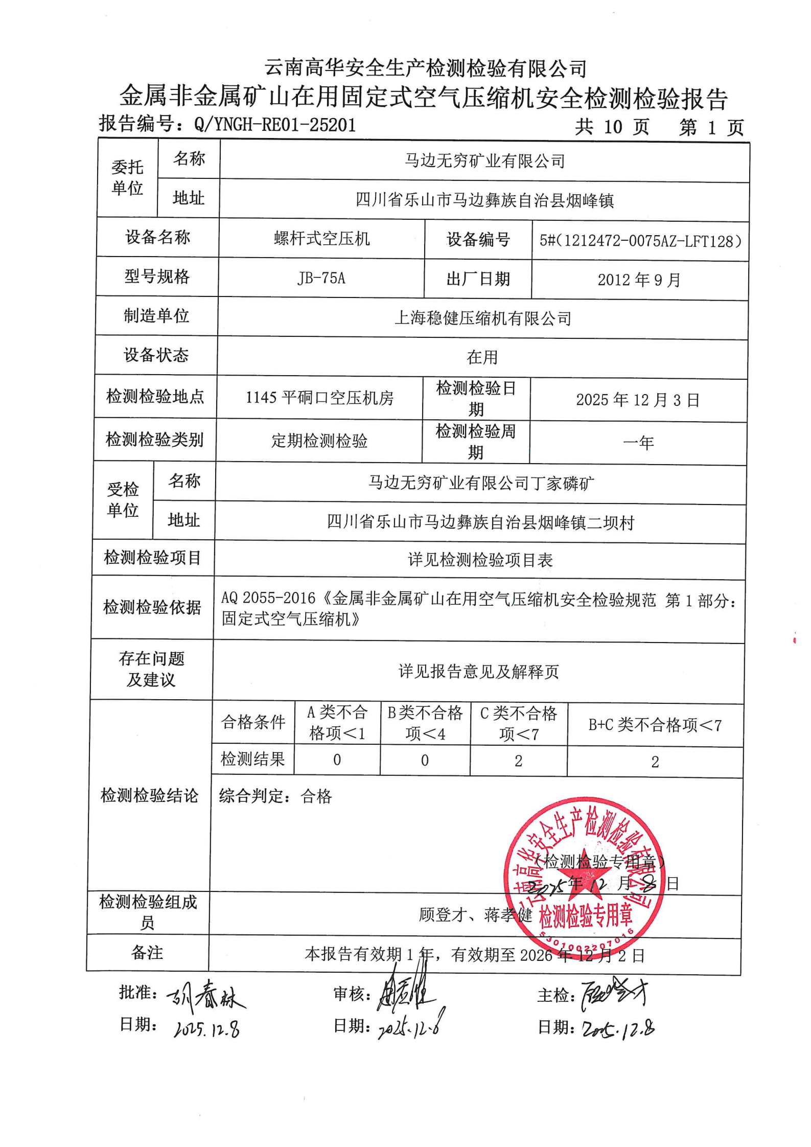 金属非金属矿山在用固定式空气压缩机安全检测检验报告