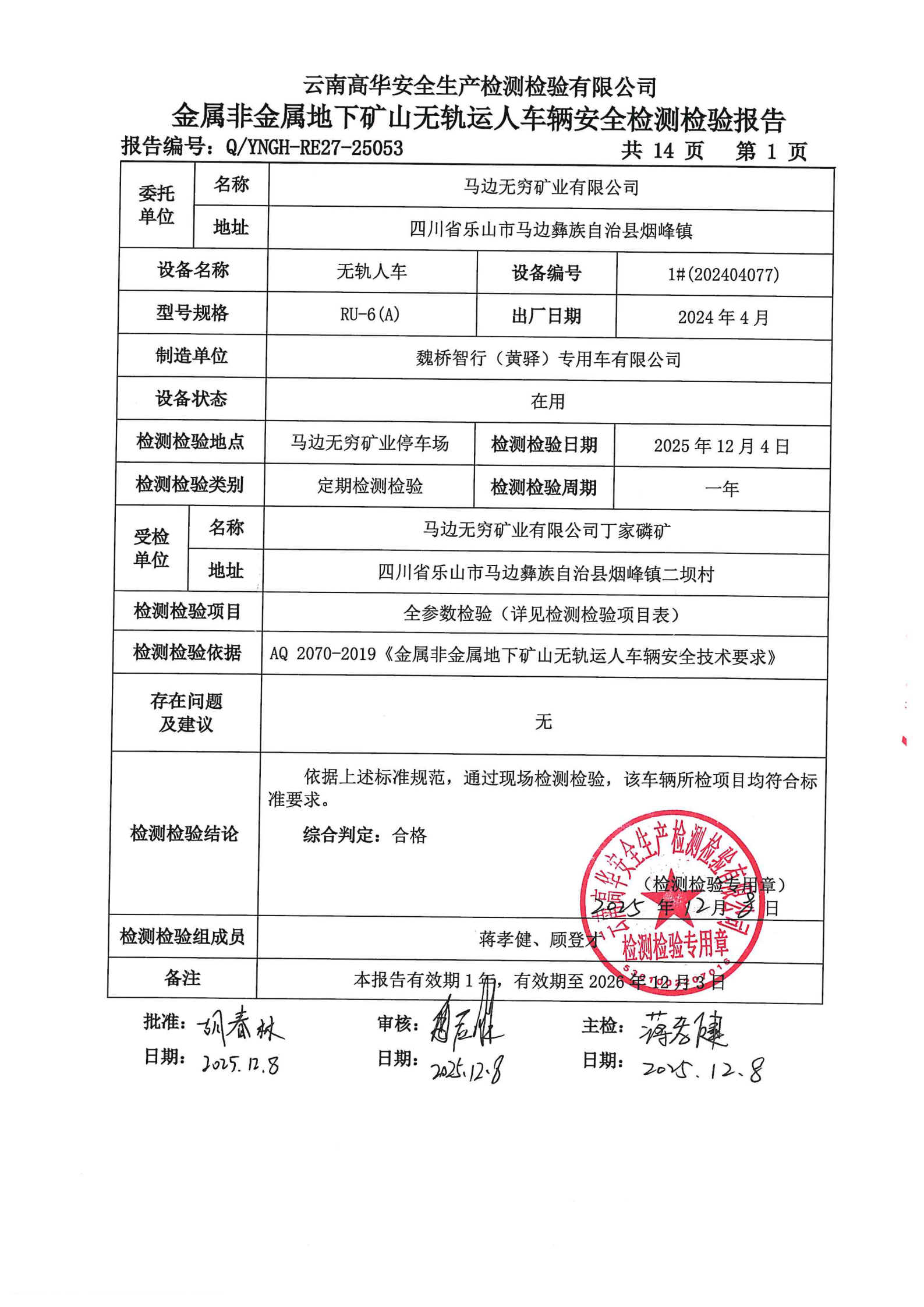 金属非金属地下矿山无轨运人车辆安全检测检验报告