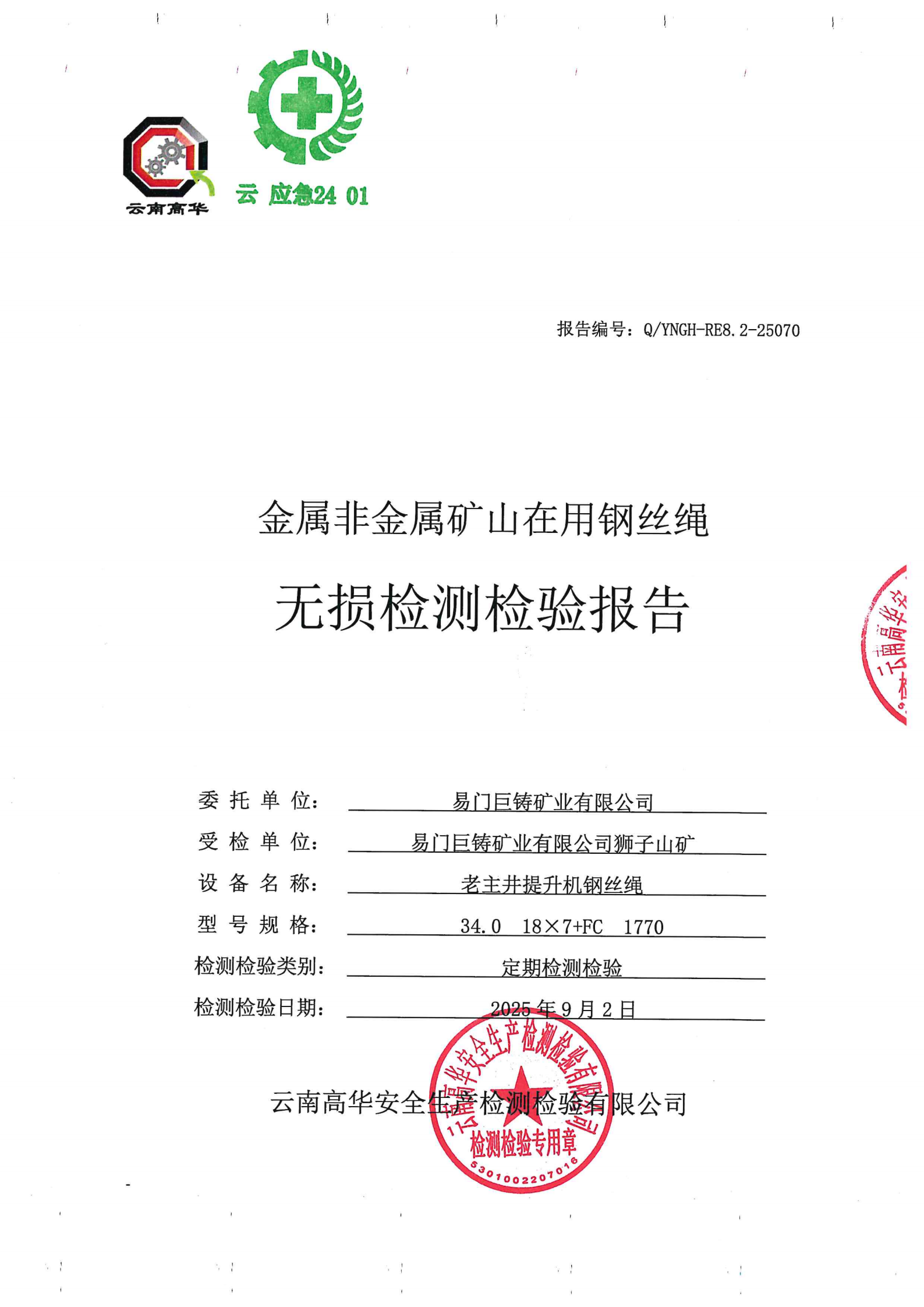 金属非金属矿山在用钢丝绳无损检测检验报告