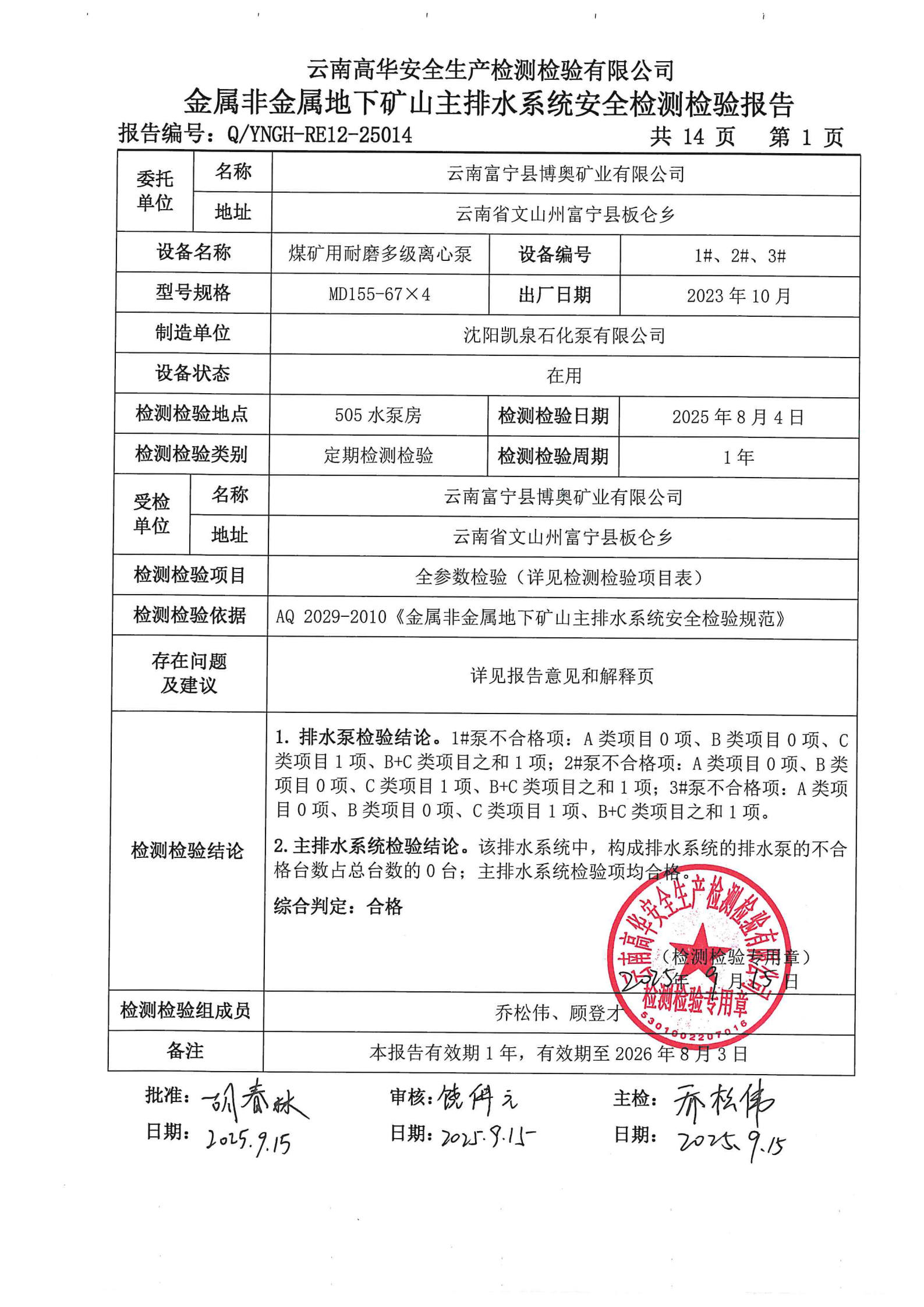 金属非金属地下矿山主排水系统安全检测检验报告
