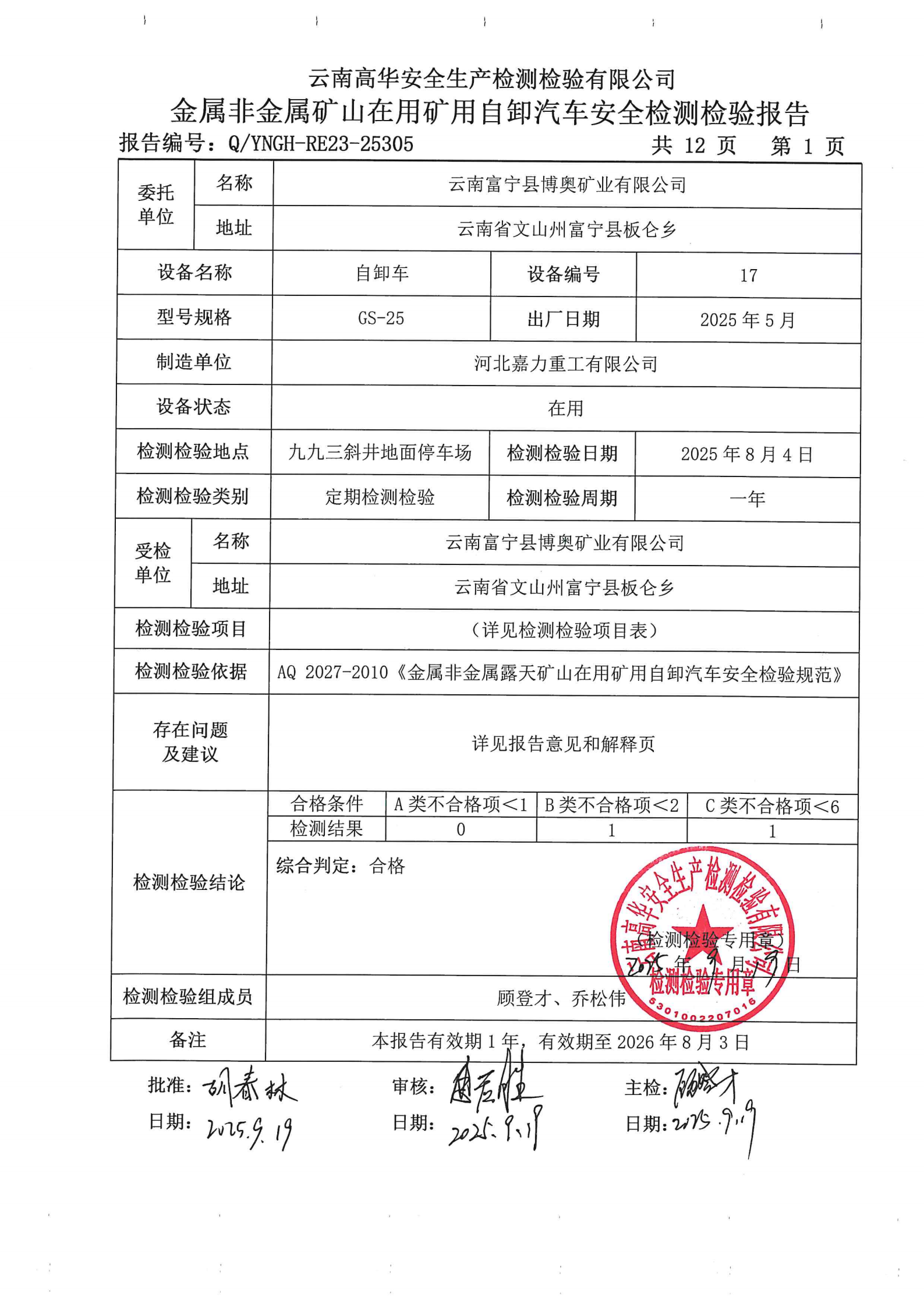 金属非金属露天矿山在用矿用自卸汽车安全检测检验报告