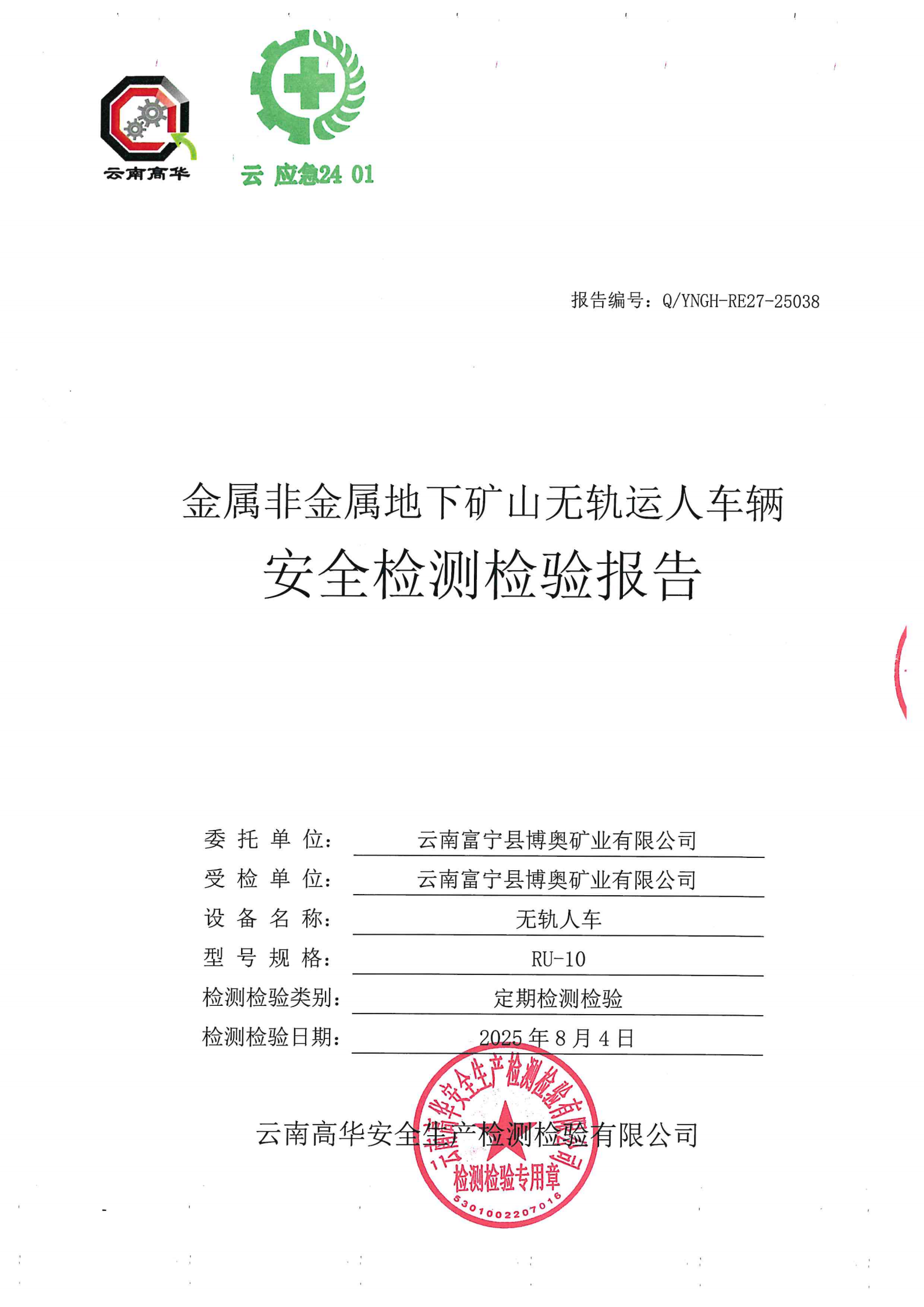 金属非金属地下矿山无轨运人车辆安全检测检验报告
