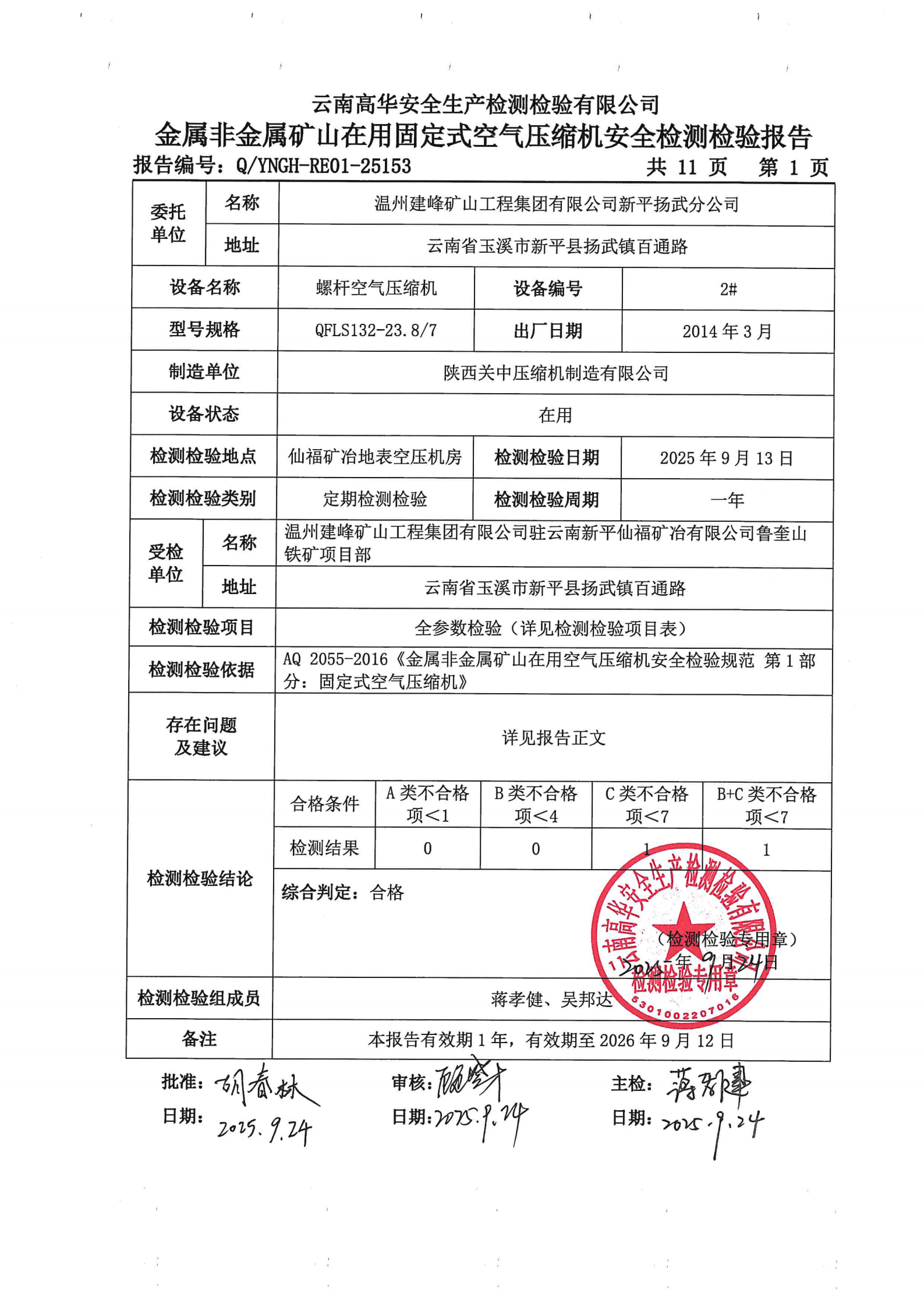 金属非金属矿山在用固定式空气压缩机安全检测检验报告