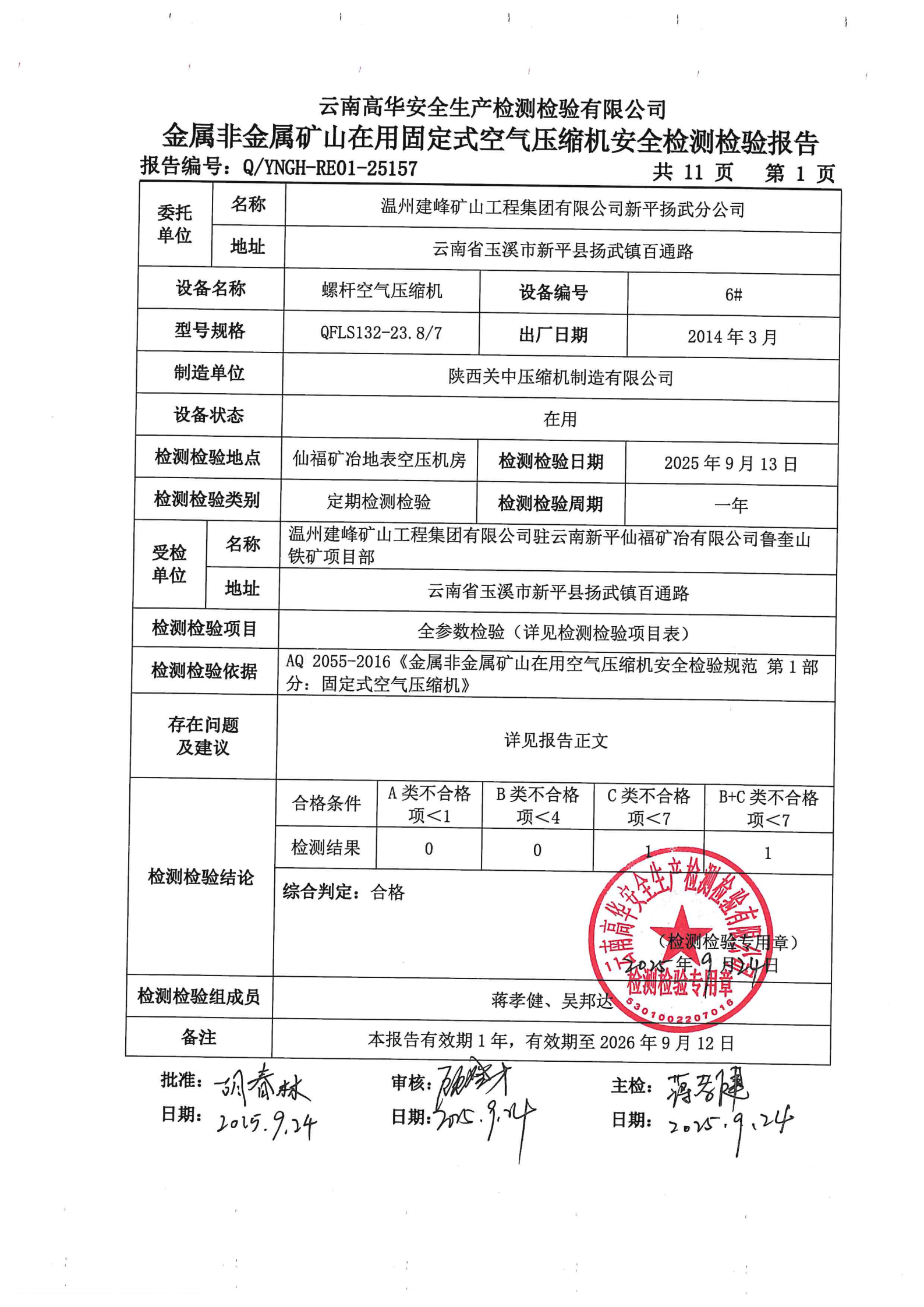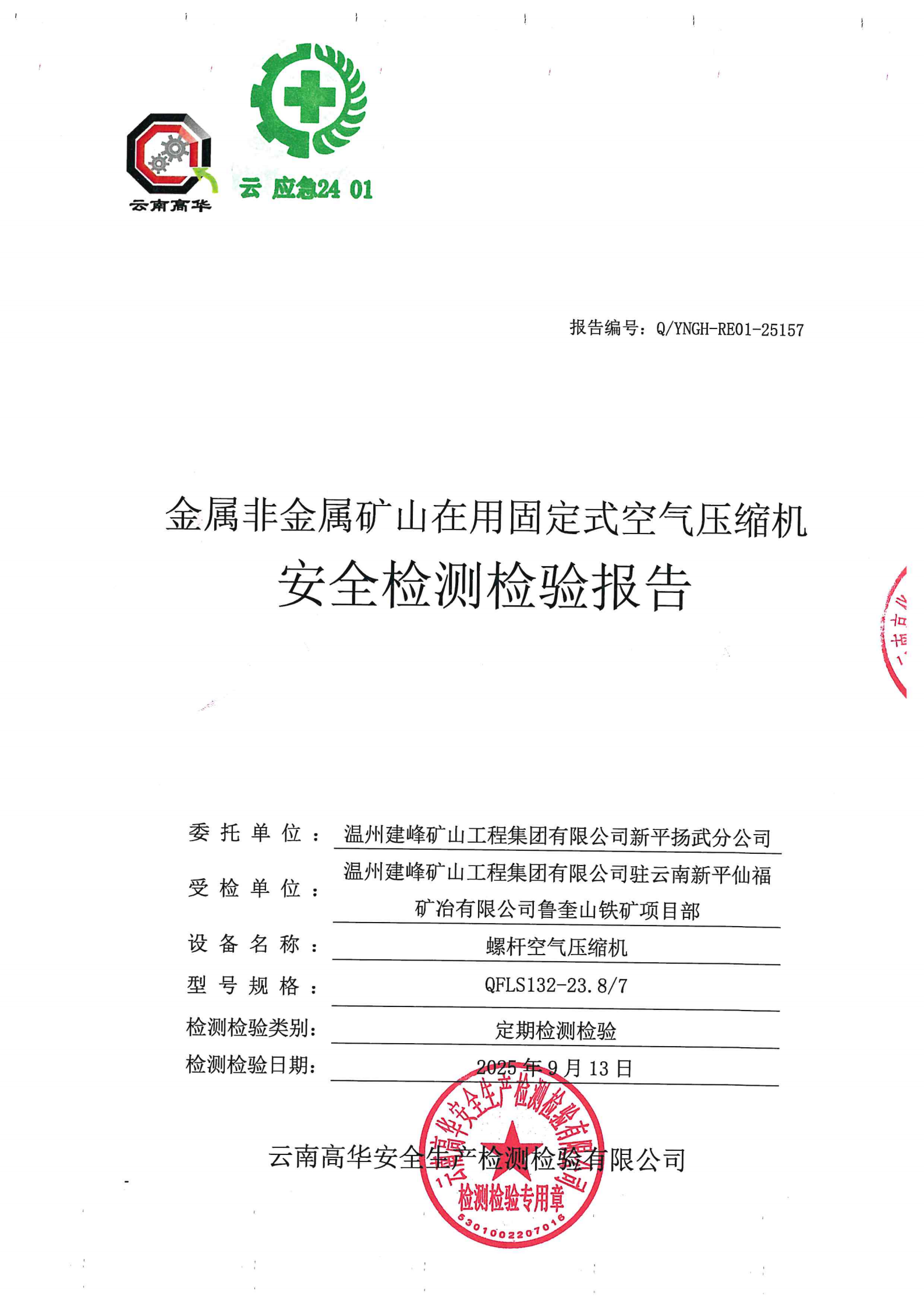 金属非金属矿山在用固定式空气压缩机安全检测检验报告
