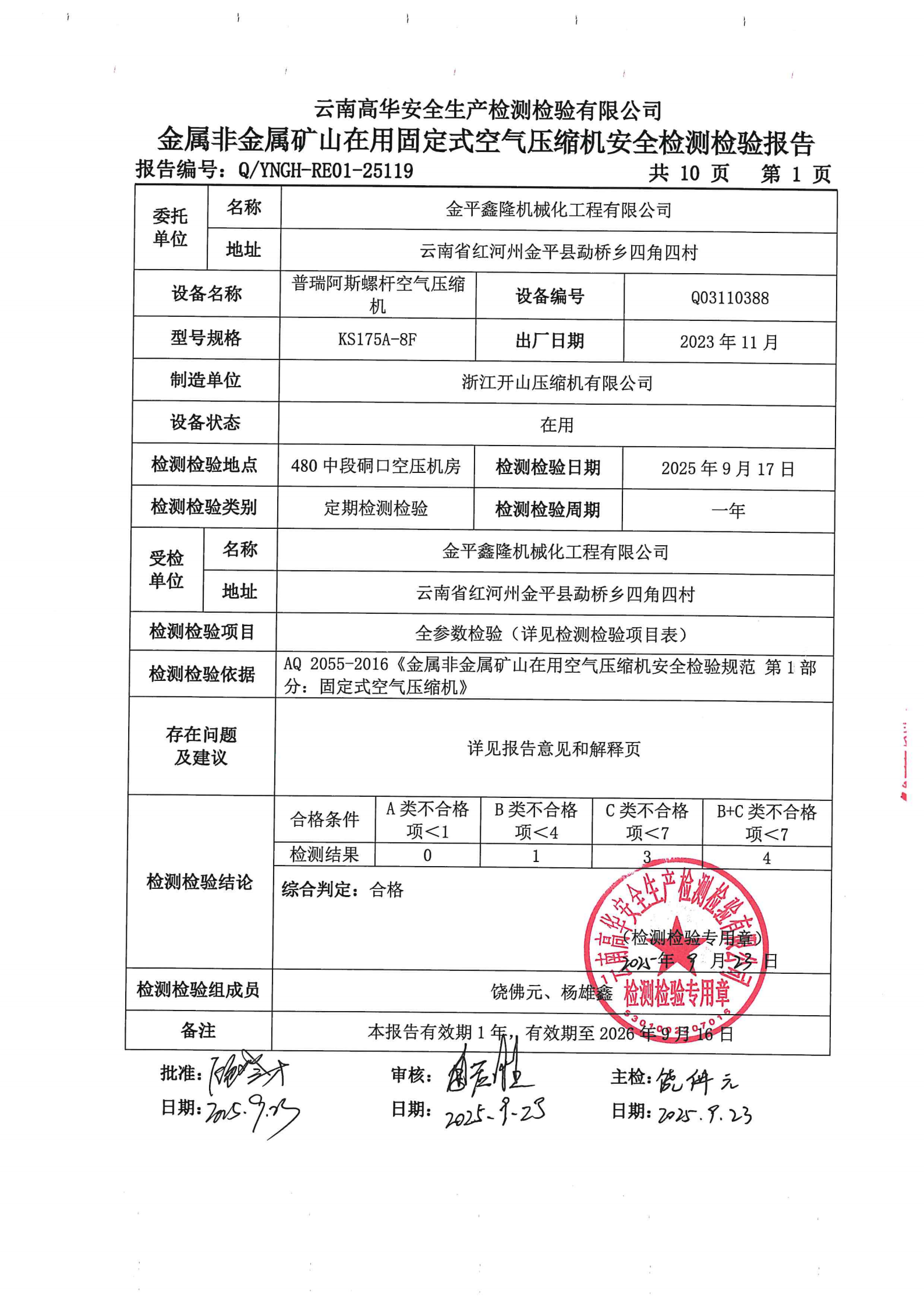 金属非金属矿山在用固定式空气压缩机安全检测检验报告