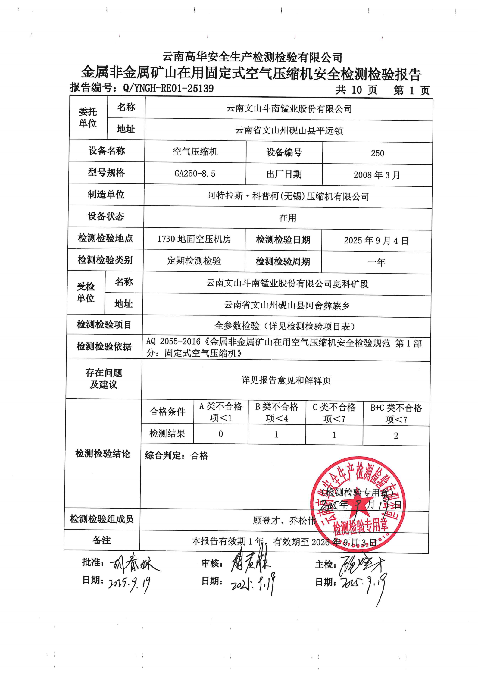 金属非金属矿山在用固定式空气压缩机安全检测检验报告