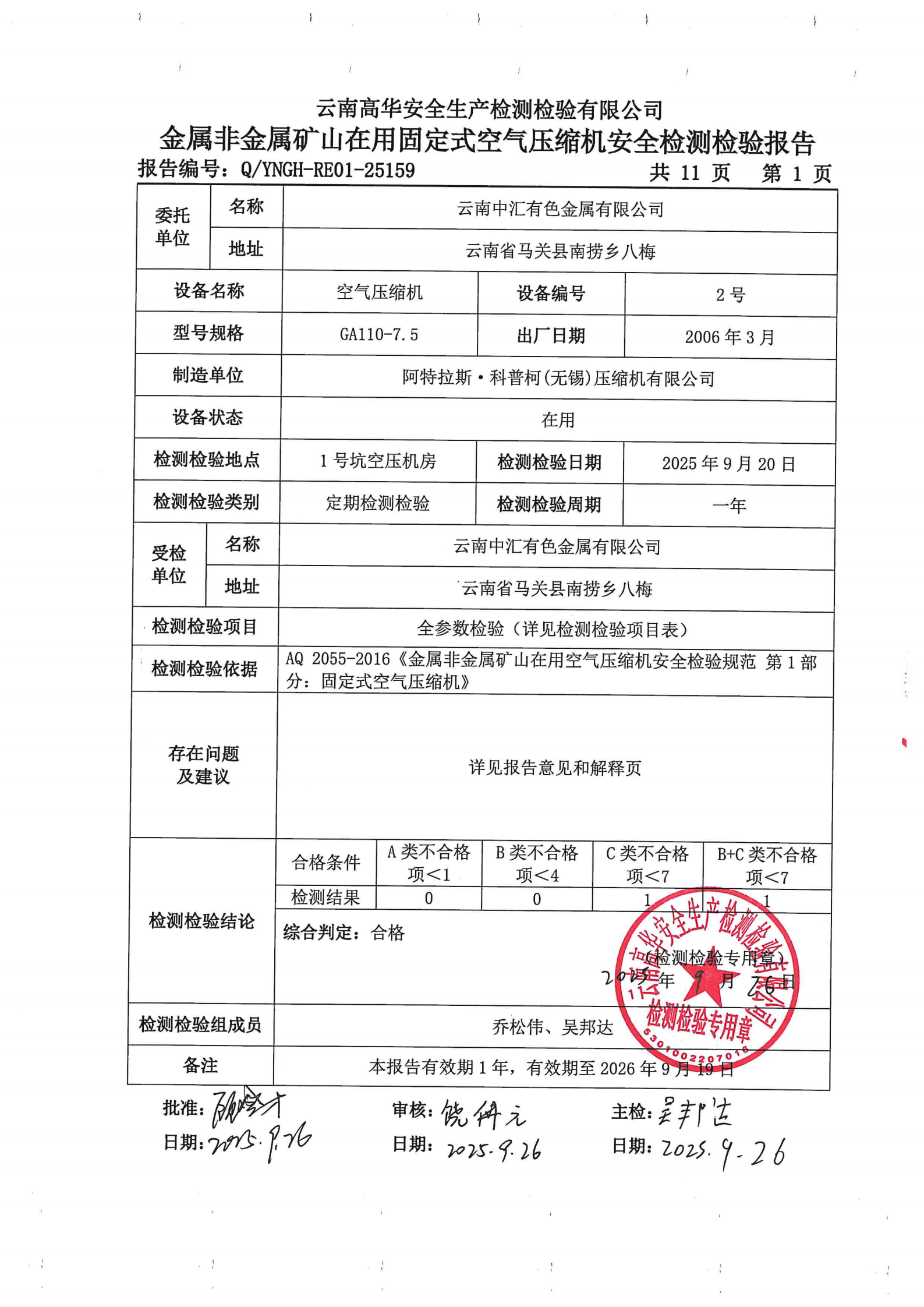 金属非金属矿山在用固定式空气压缩机安全检测检验报告