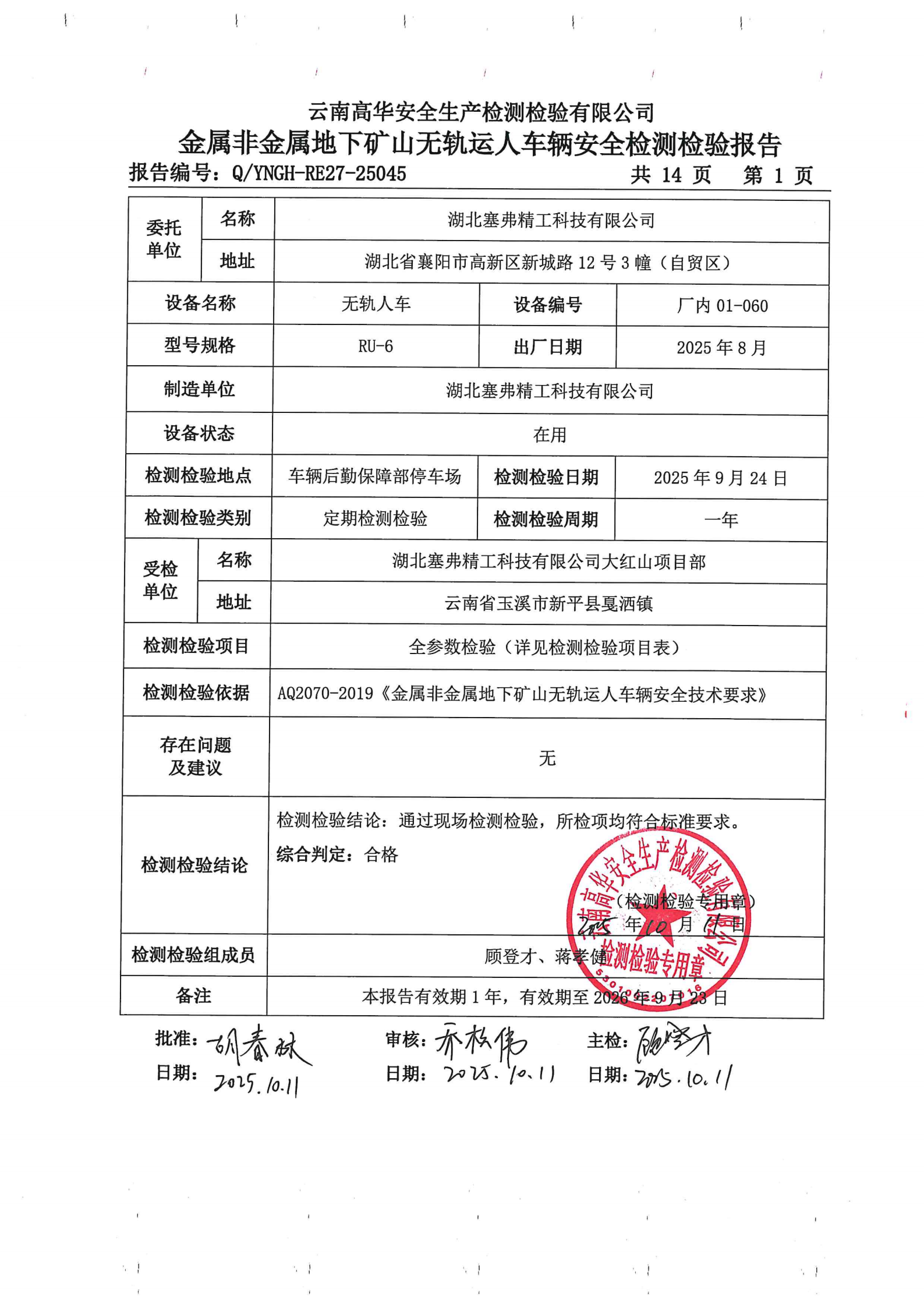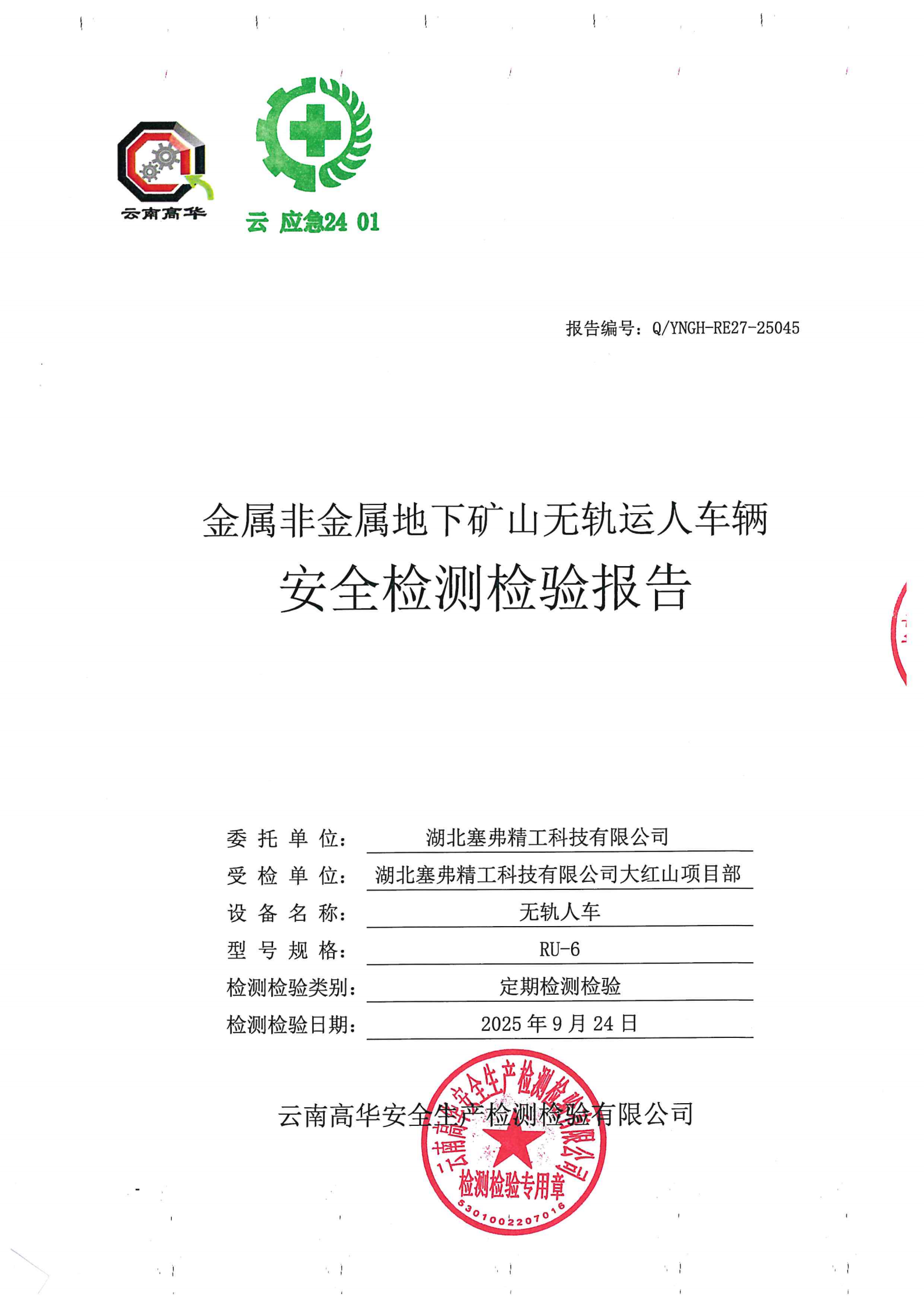 金属非金属地下矿山无轨运人车辆安全检测检验报告