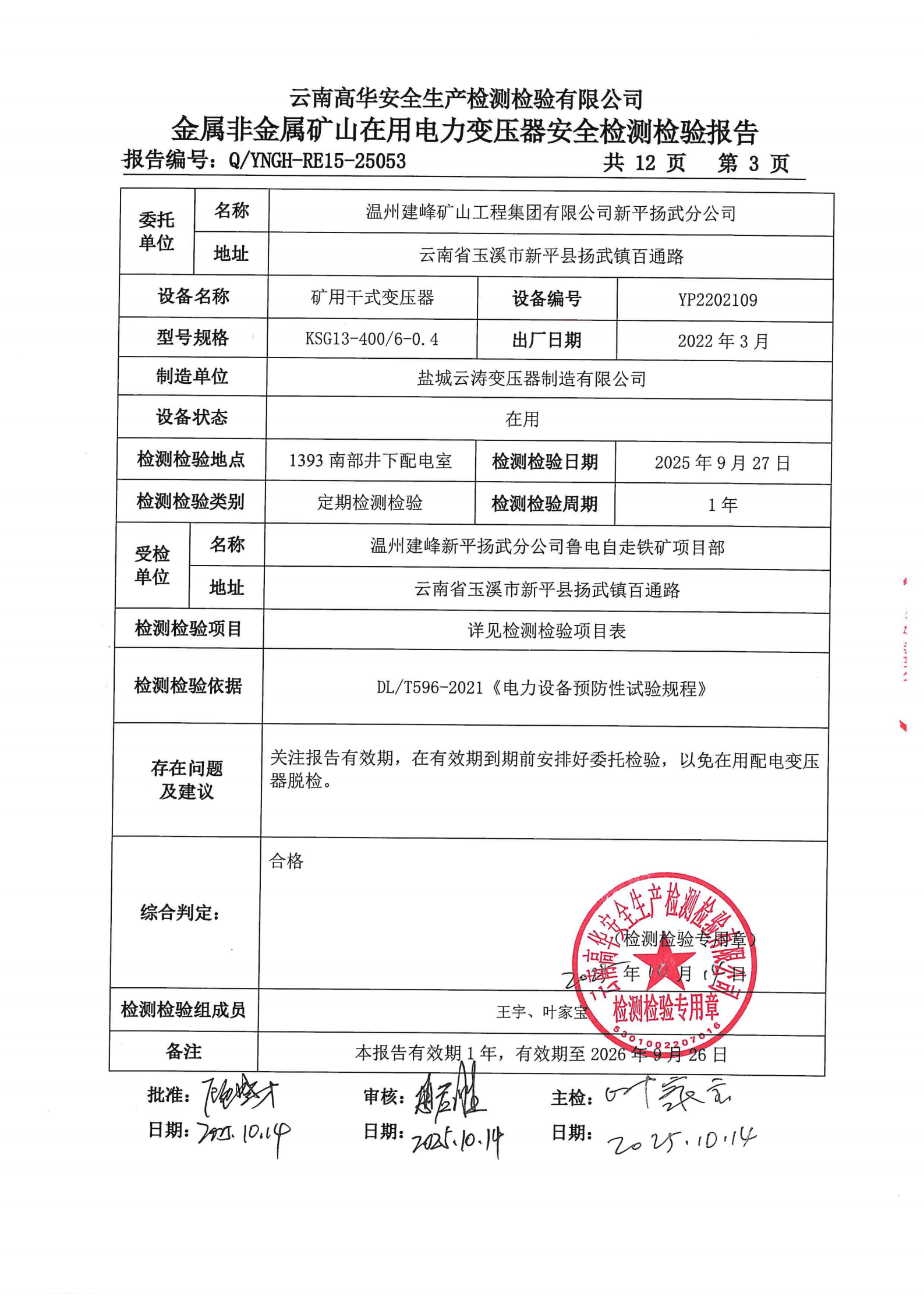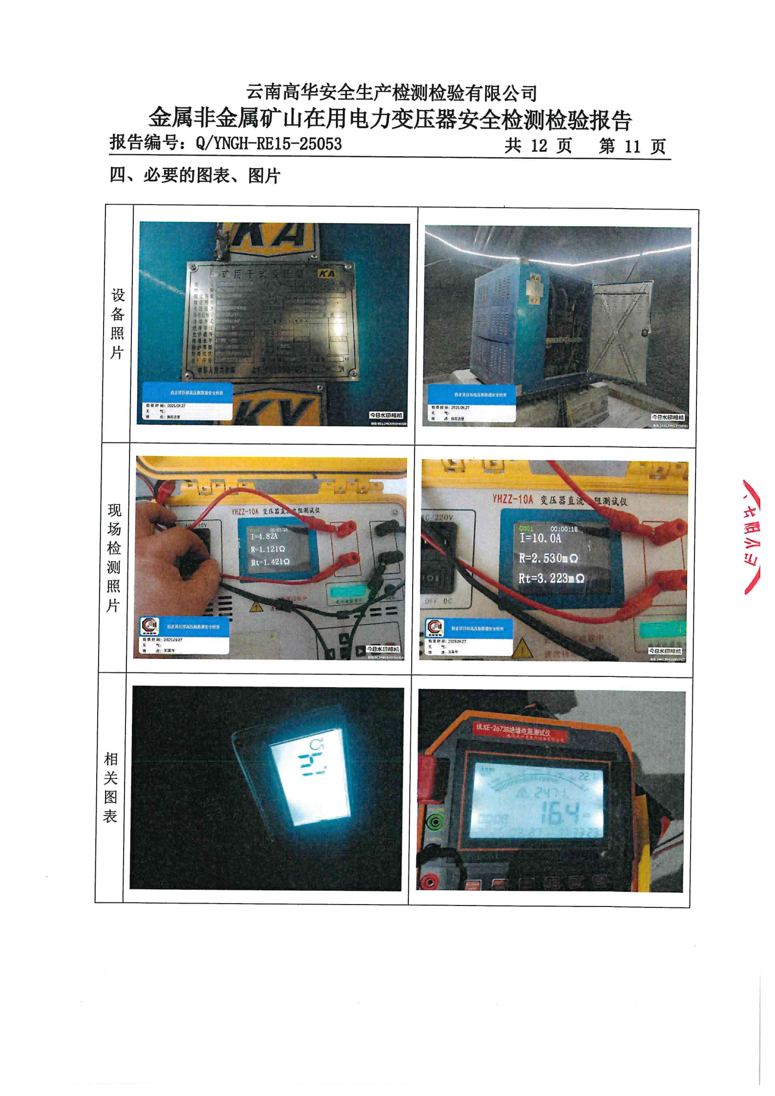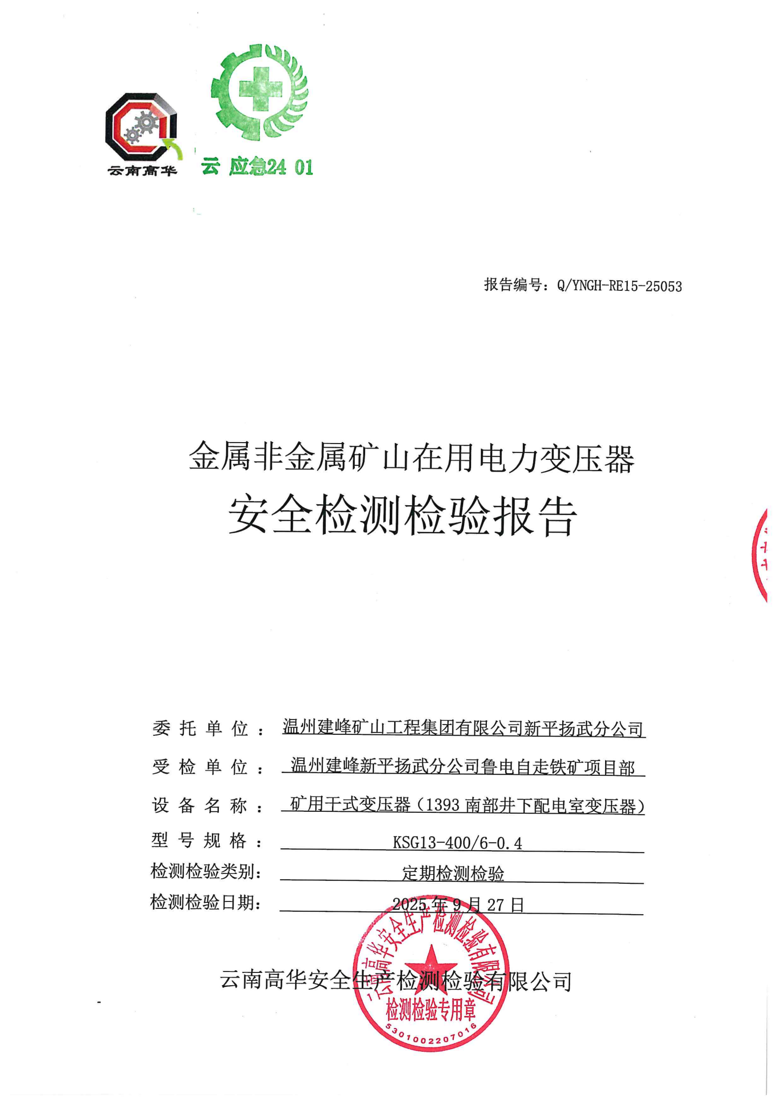 金属非金属矿山在用电力变压器安全检测检验报告