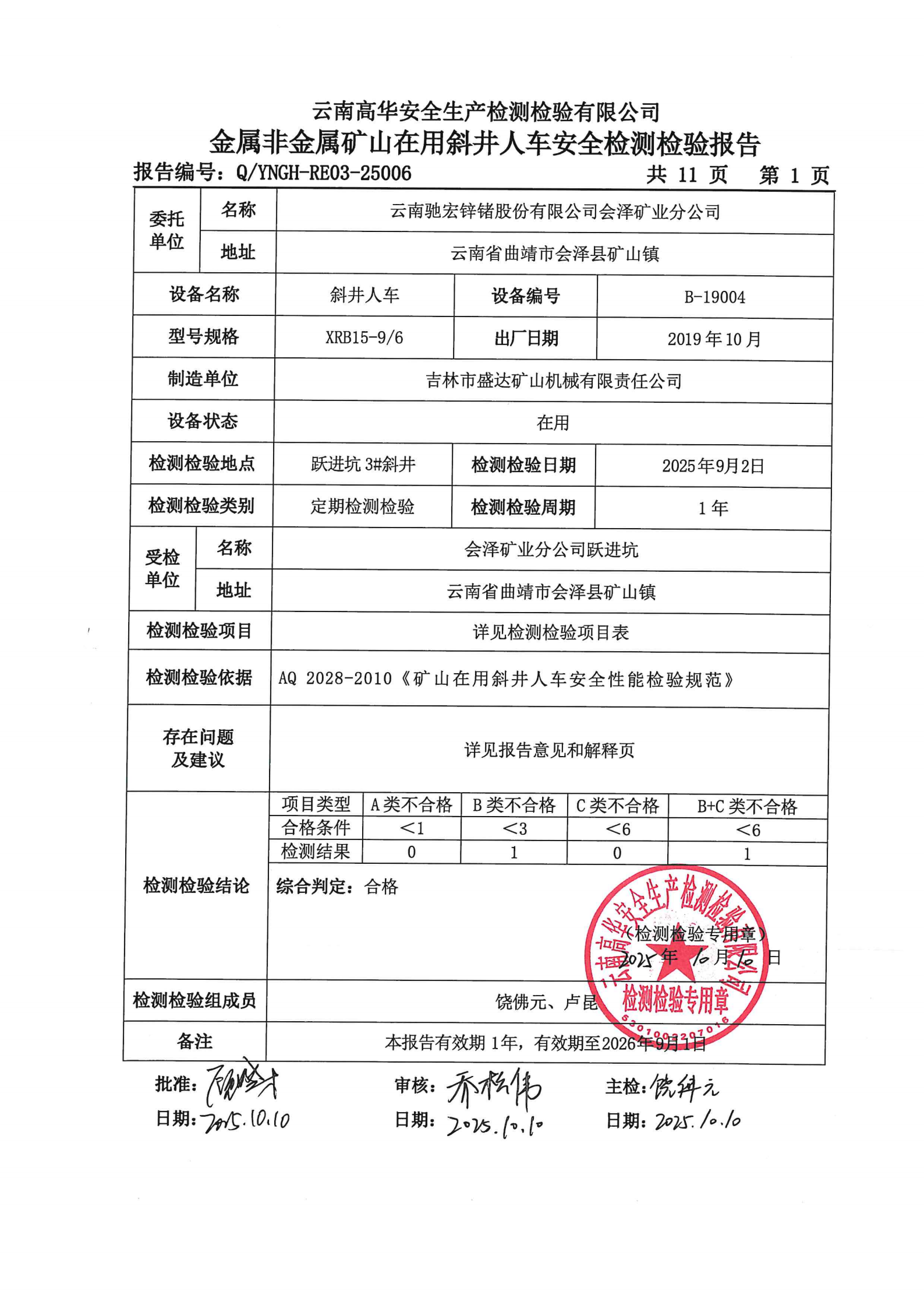 金属非金属矿山在用斜井人车安全检测检验报告
