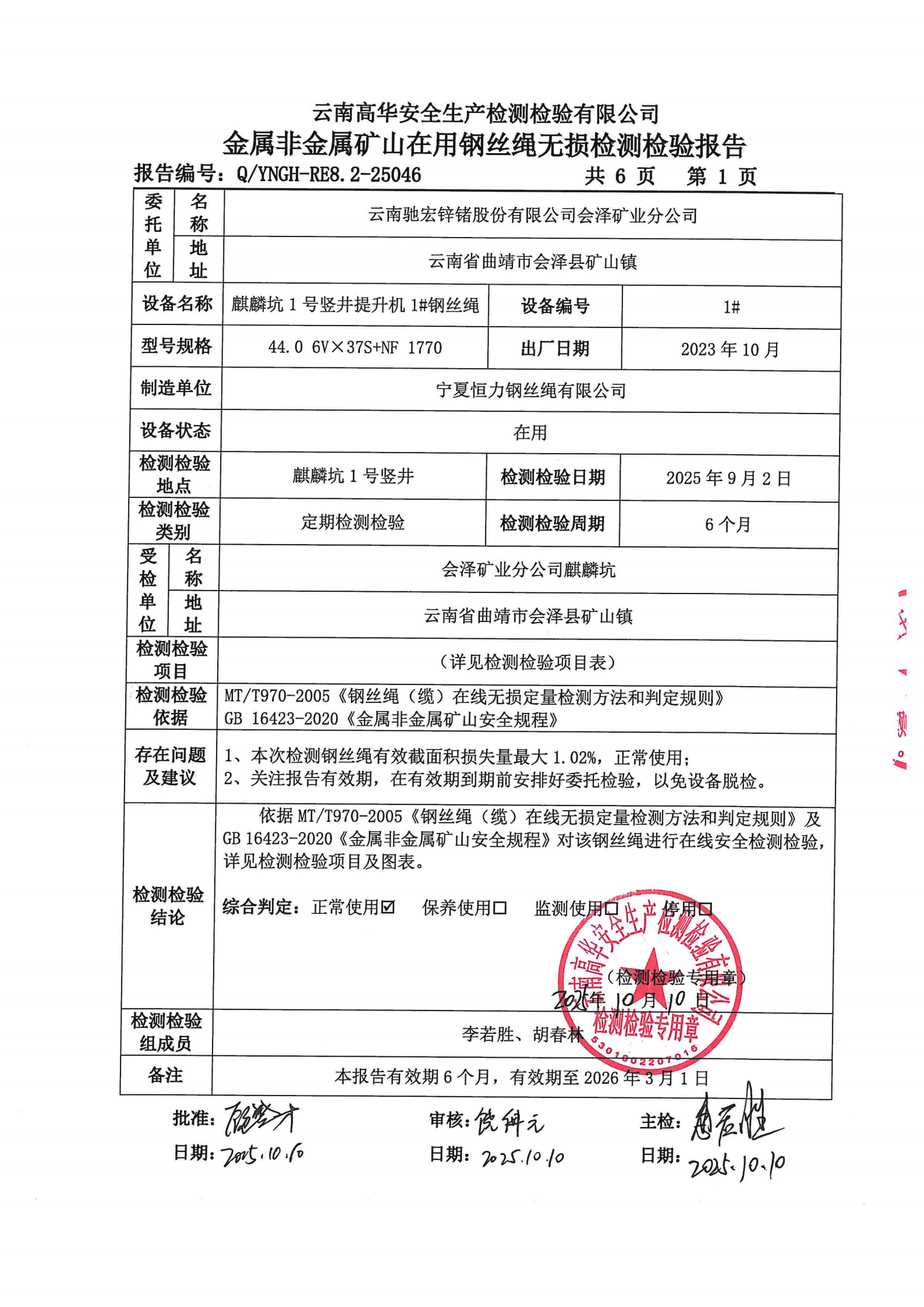 金属非金属矿山在用钢丝绳无损检测检验报告