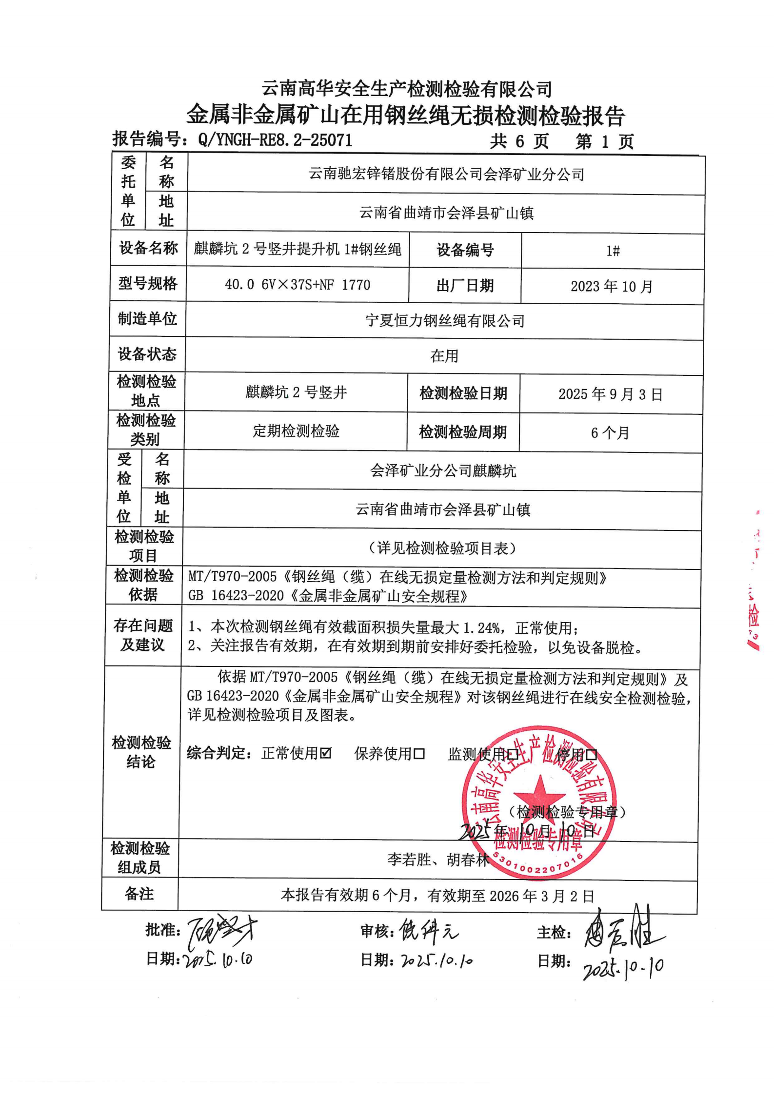金属非金属矿山在用钢丝绳无损检测检验报告