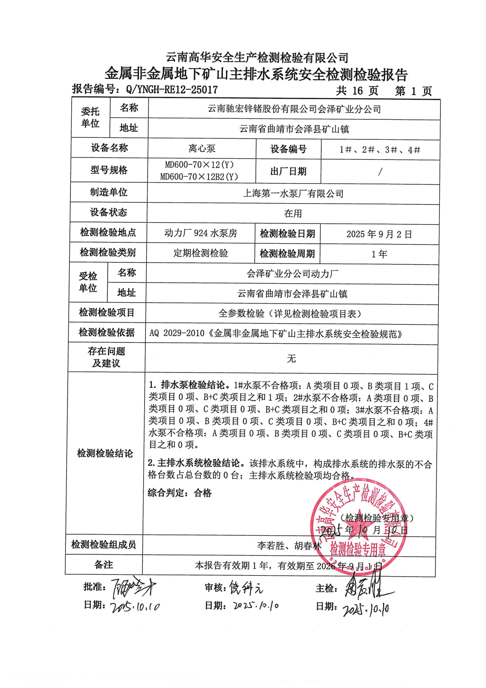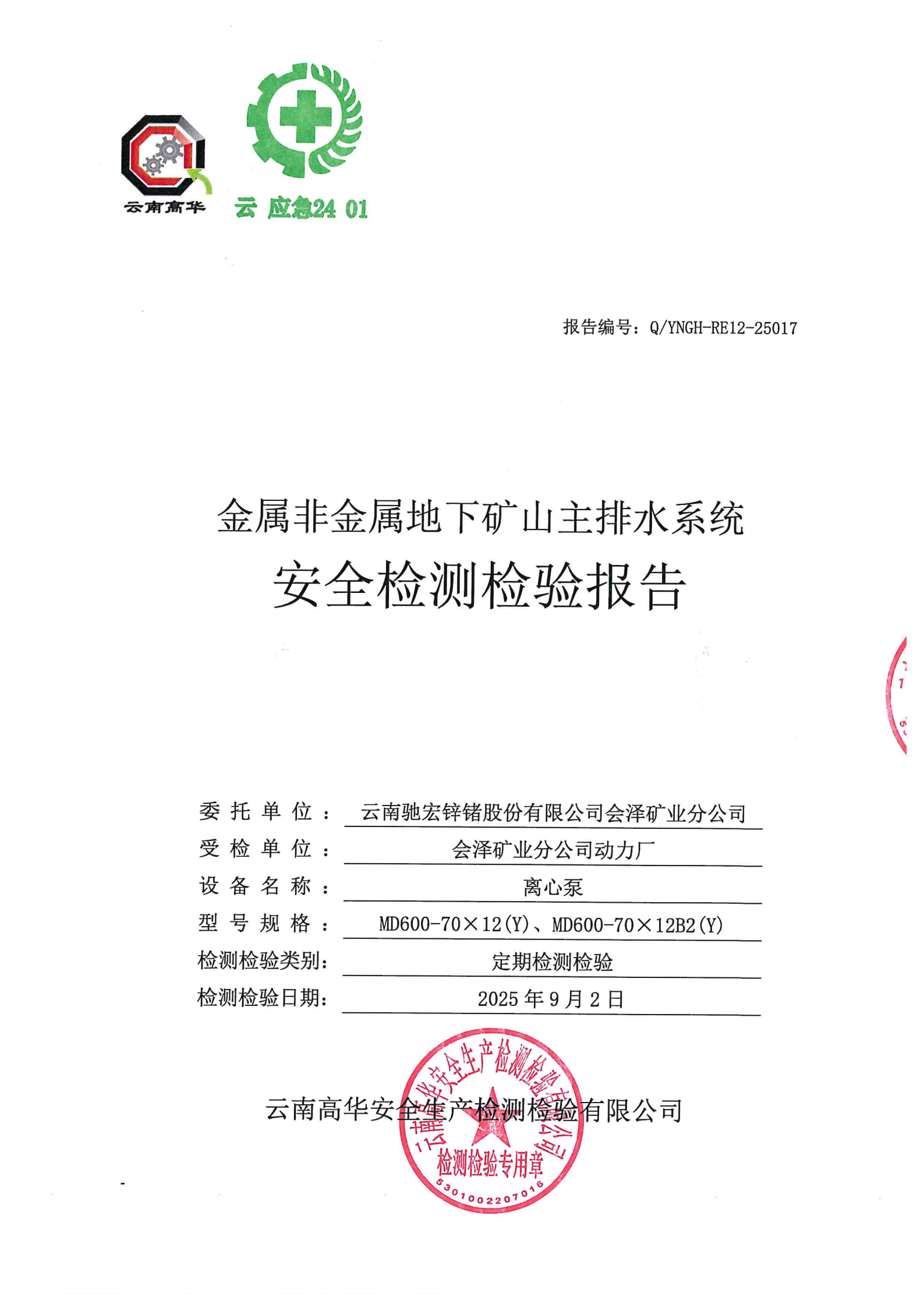 金属非金属地下矿山主排水系统安全检测检验报告