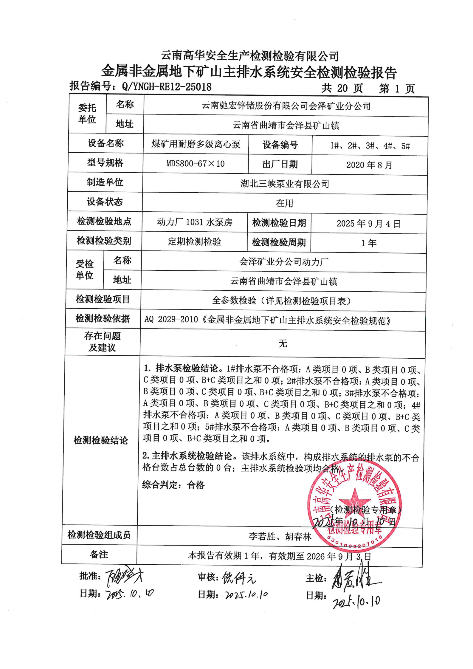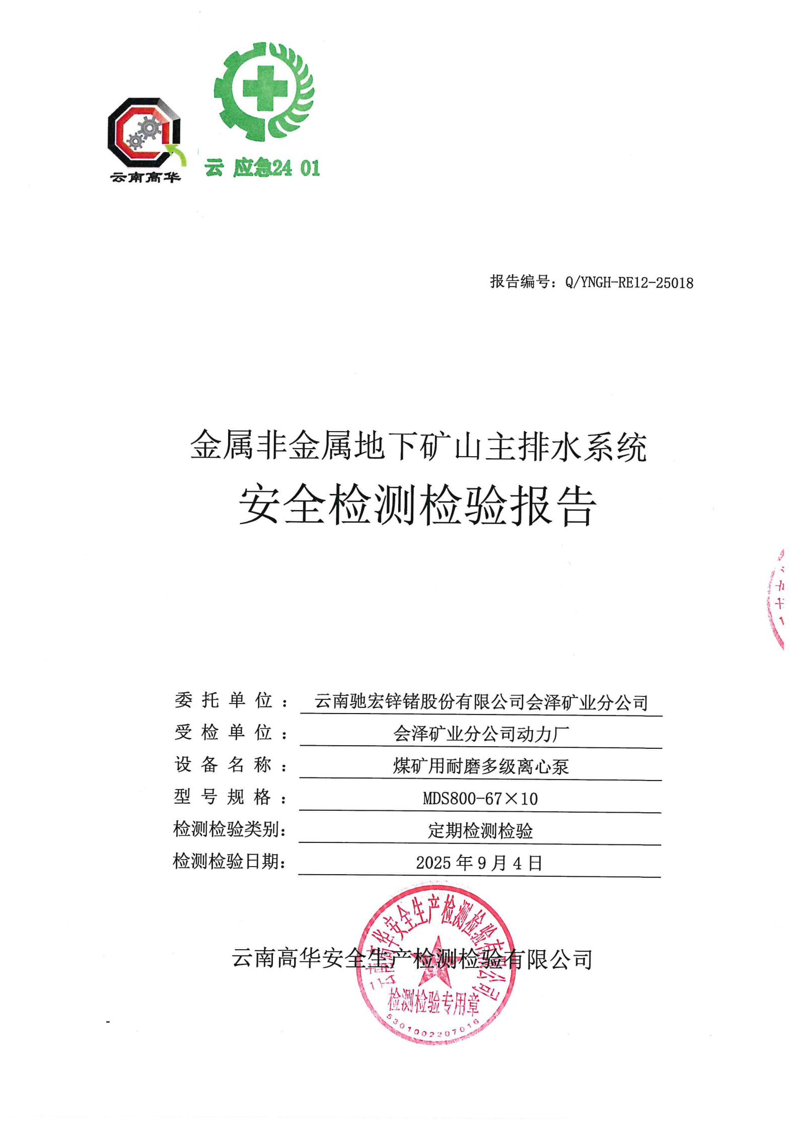 金属非金属地下矿山主排水系统安全检测检验报告