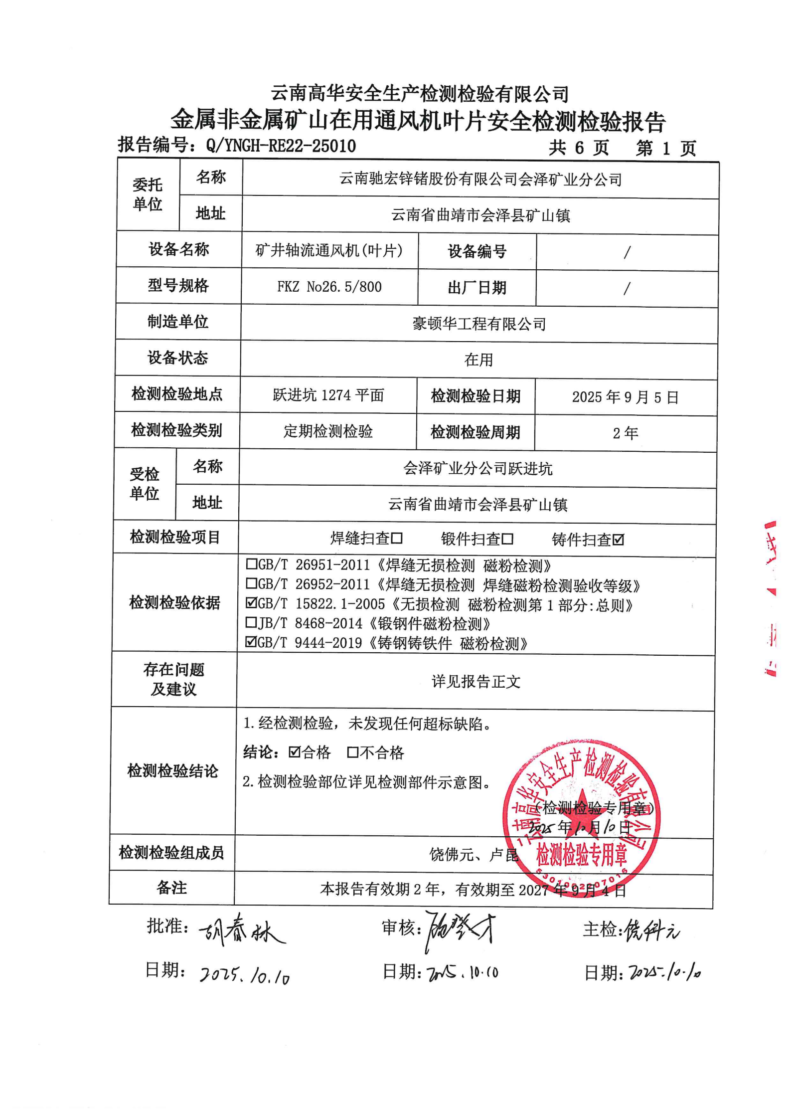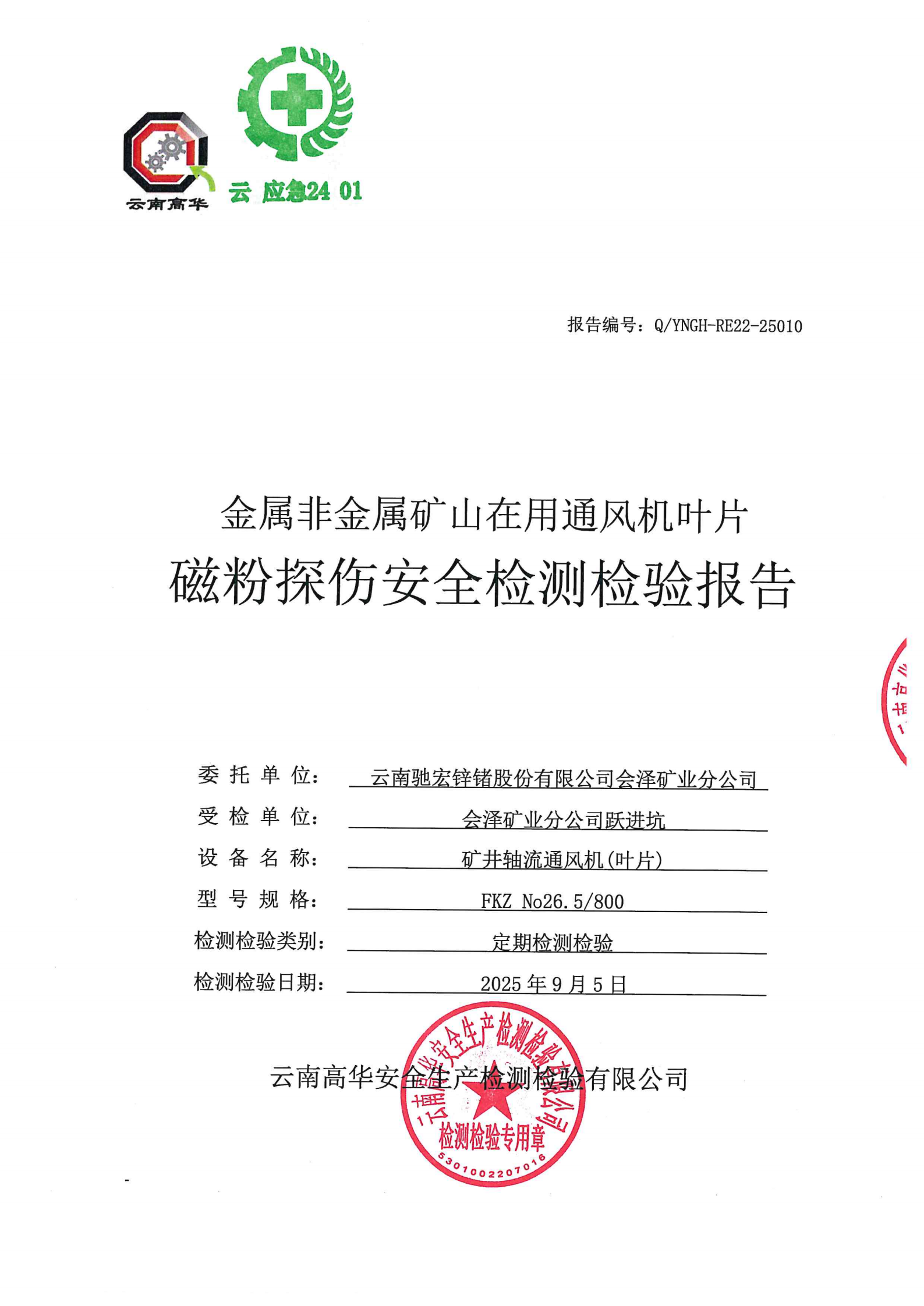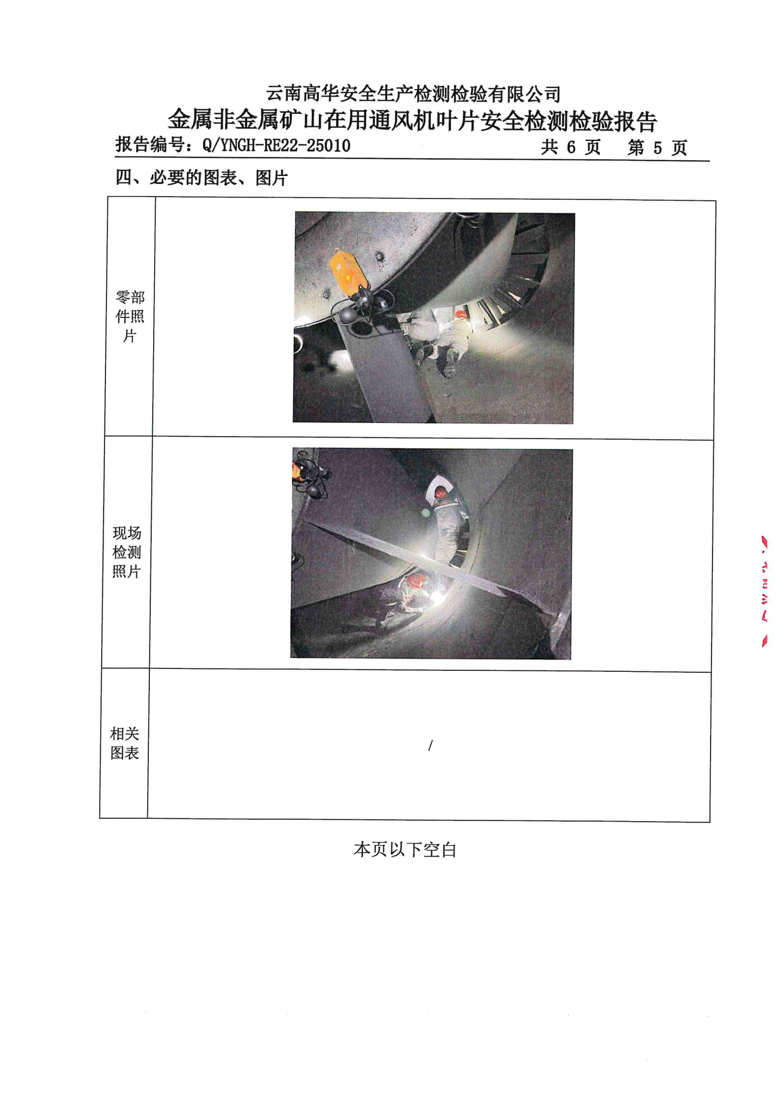 金属非金属矿山在用通风机叶片磁粉探伤安全检测检验报告