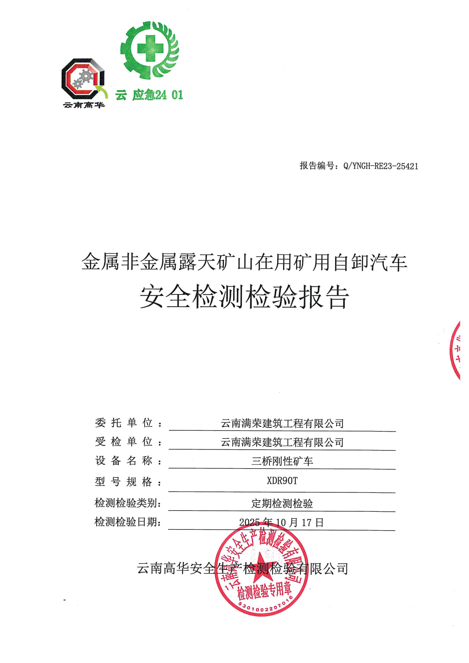 金属非金属露天矿山在用矿用自卸汽车安全检测检验报告