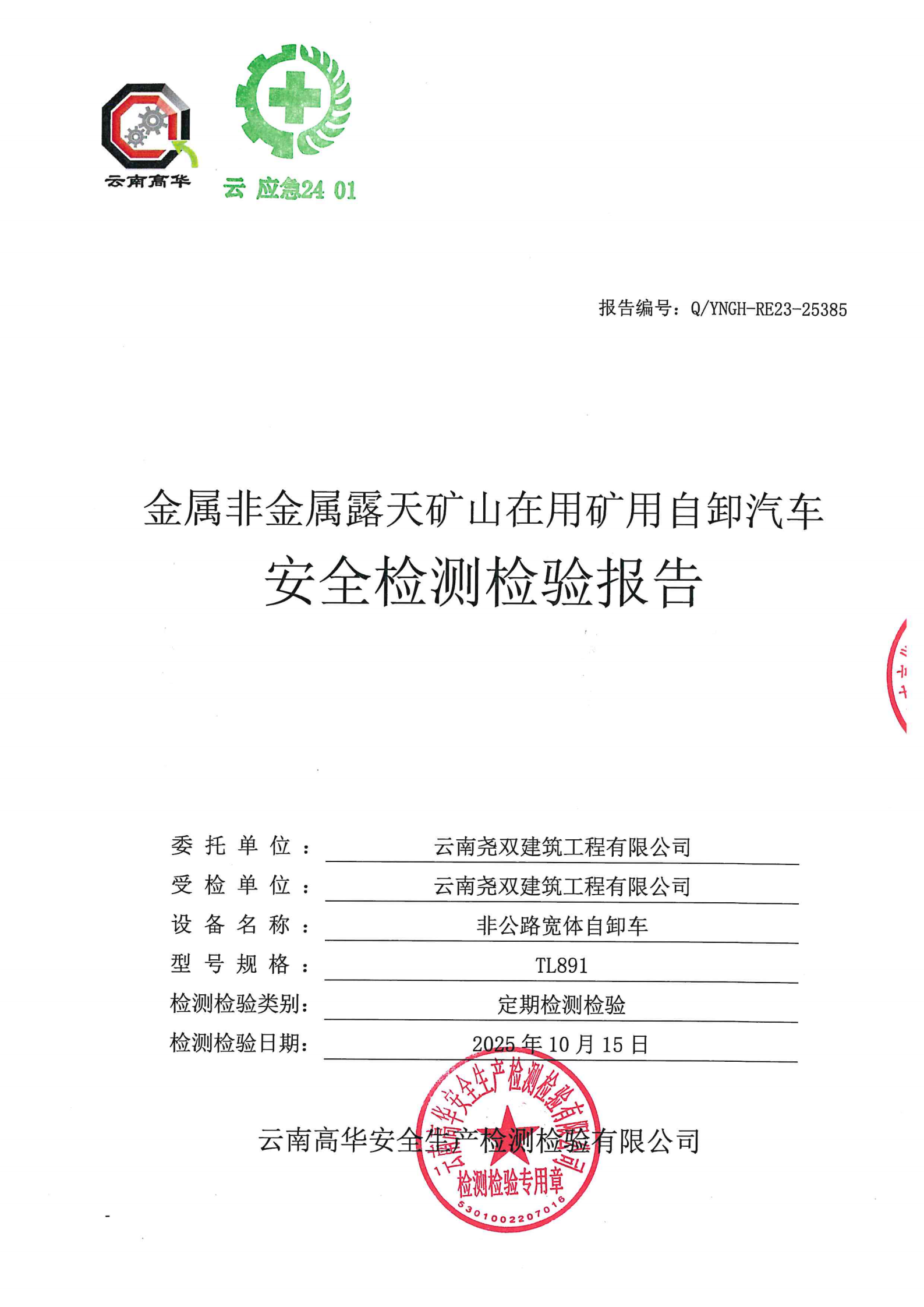 金属非金属露天矿山在用矿用自卸汽车安全检测检验报告