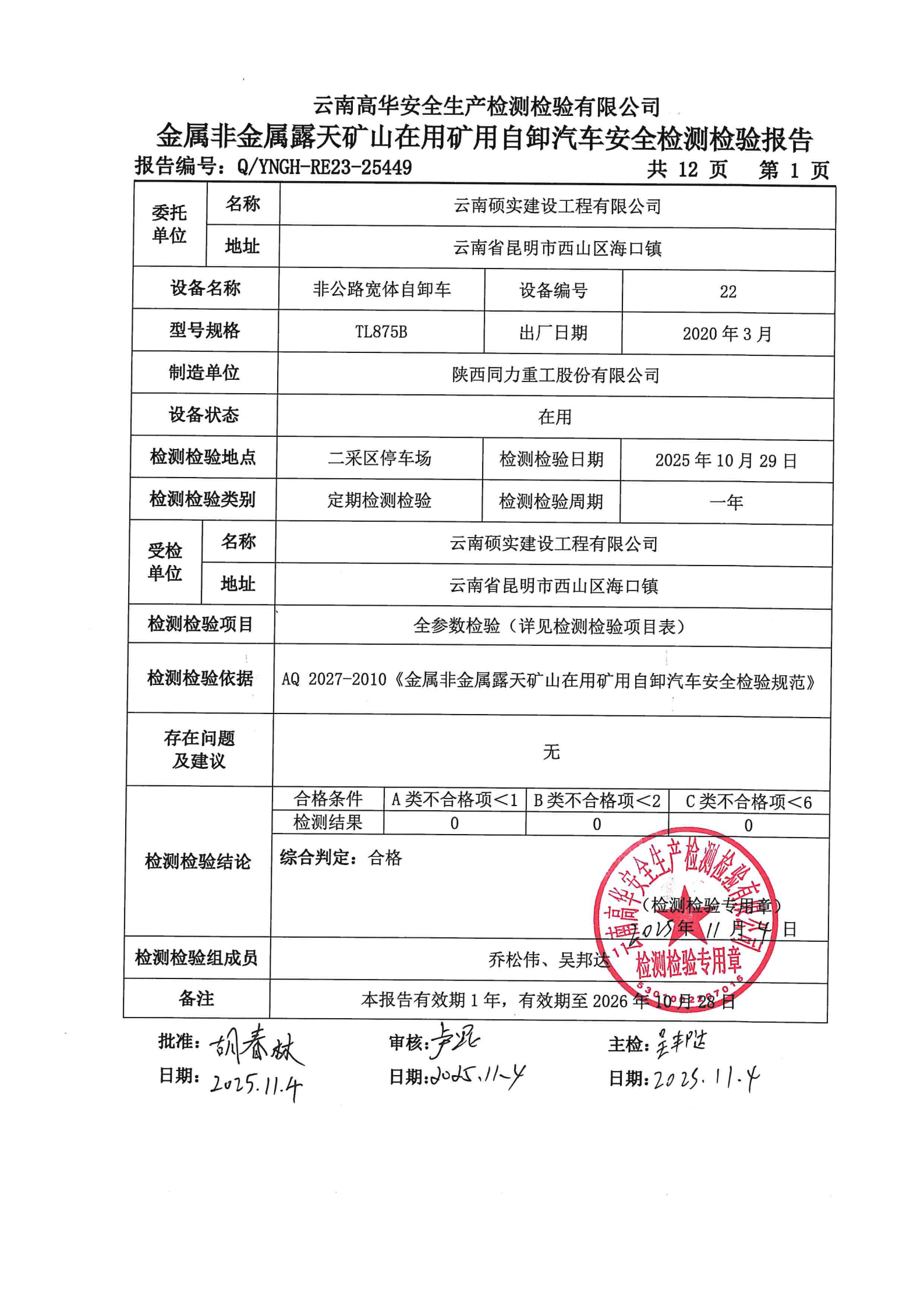 金属非金属露天矿山在用矿用自卸汽车安全检测检验报告
