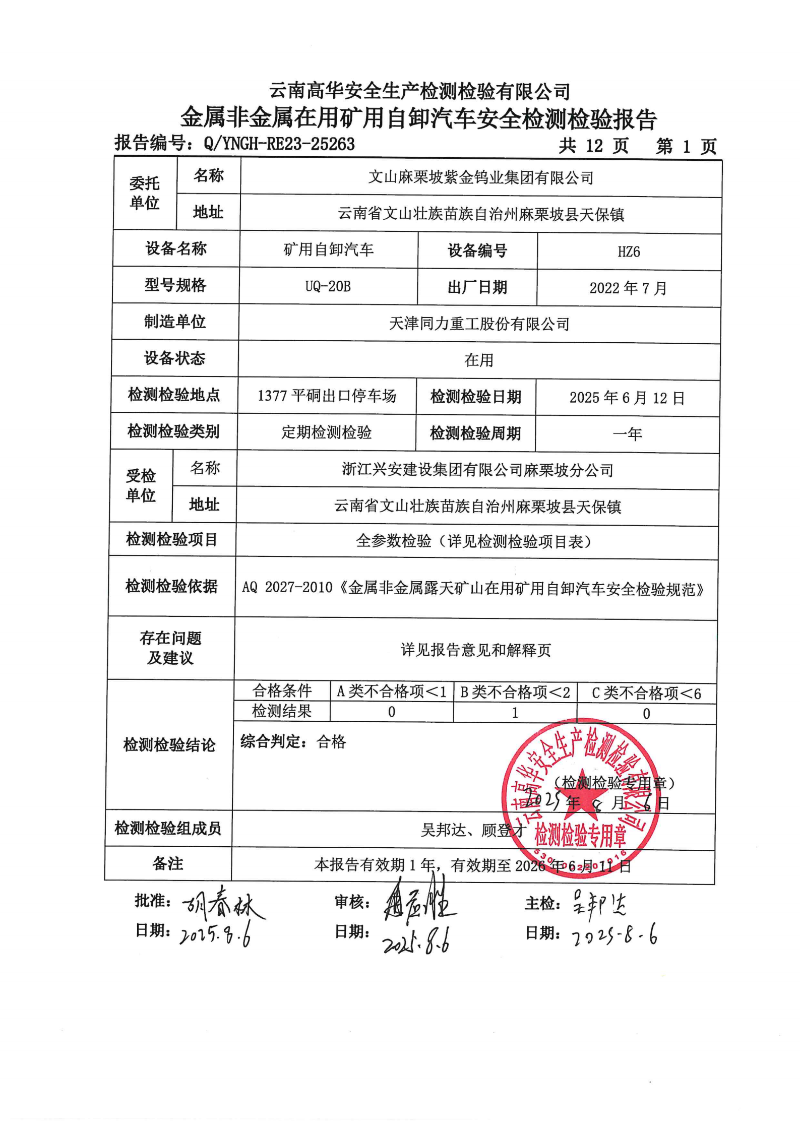 金属非金属在用矿用自卸汽车安全检测检验报告