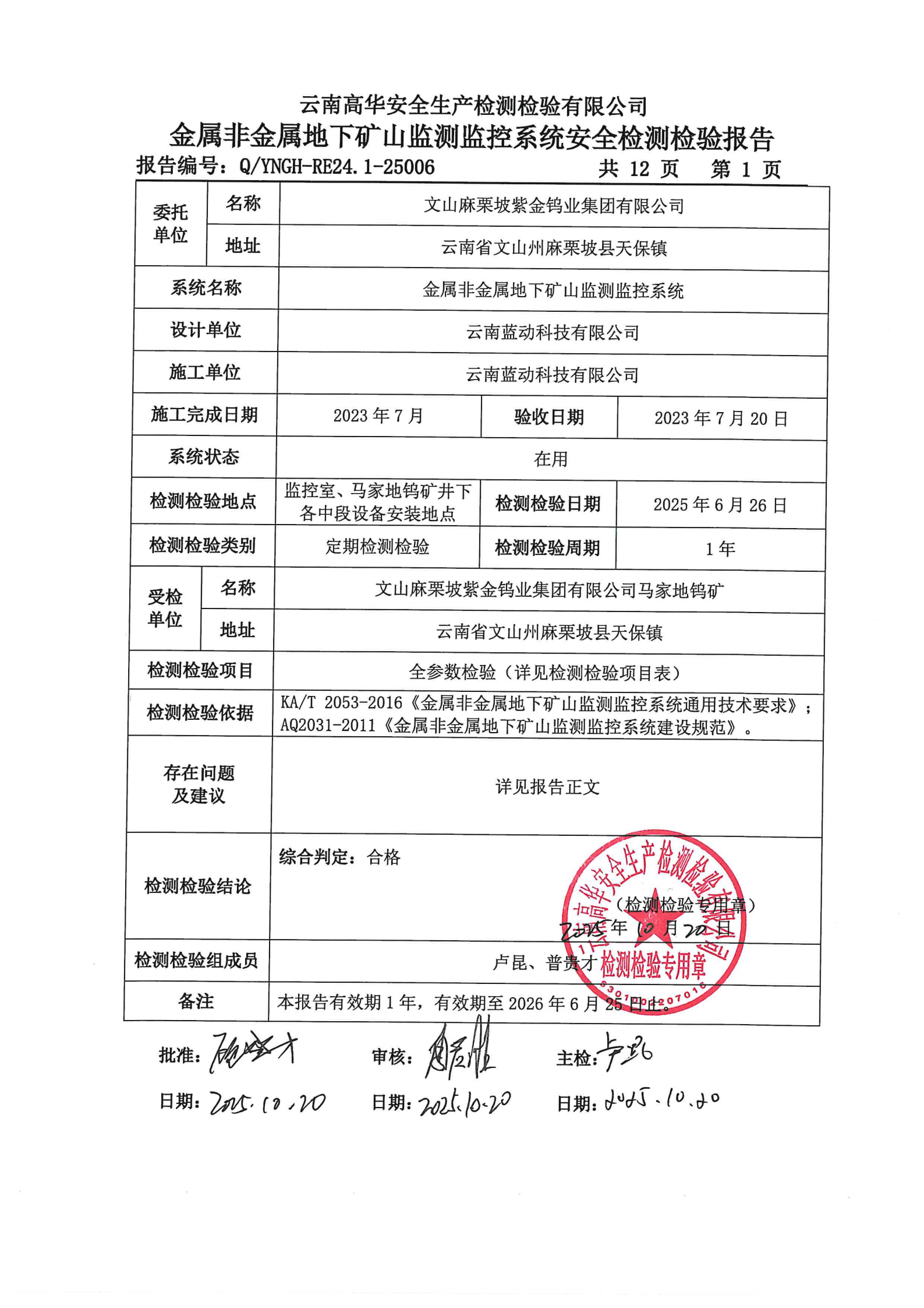金属非金属地下矿山监测监控系统安全检测检验报告