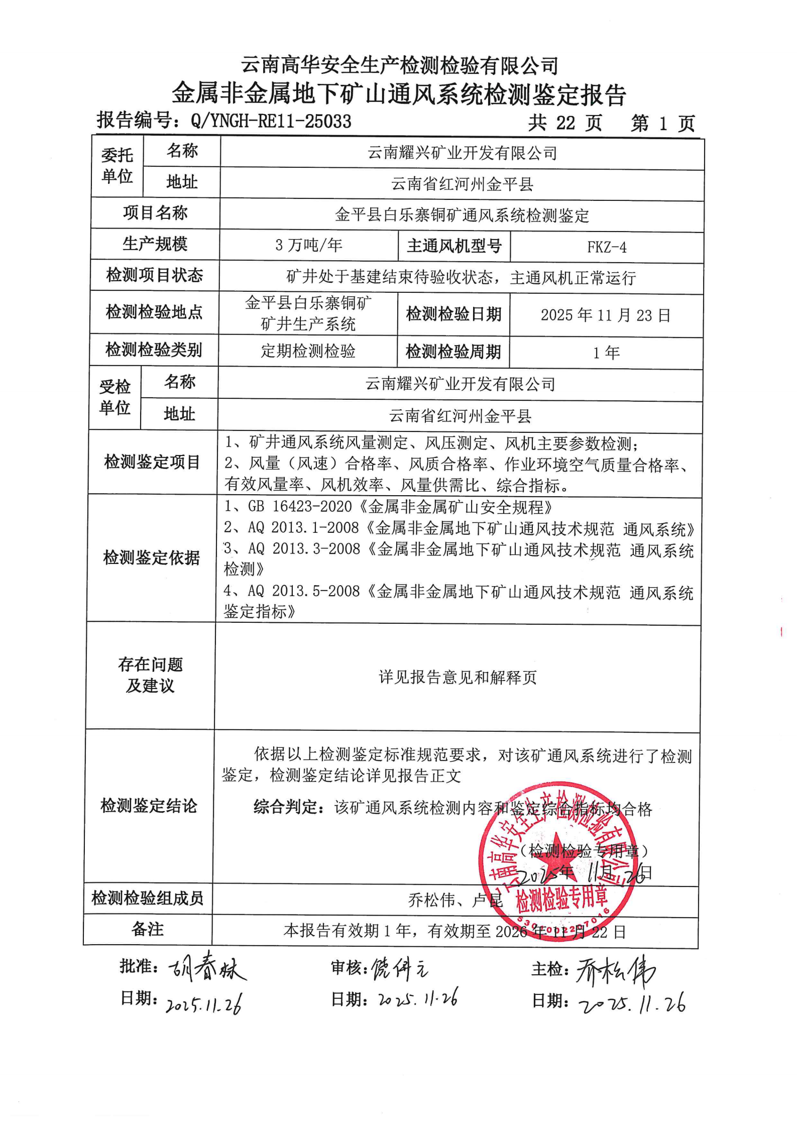 金属非金属矿山在用主通风机系统安全检测检验报告