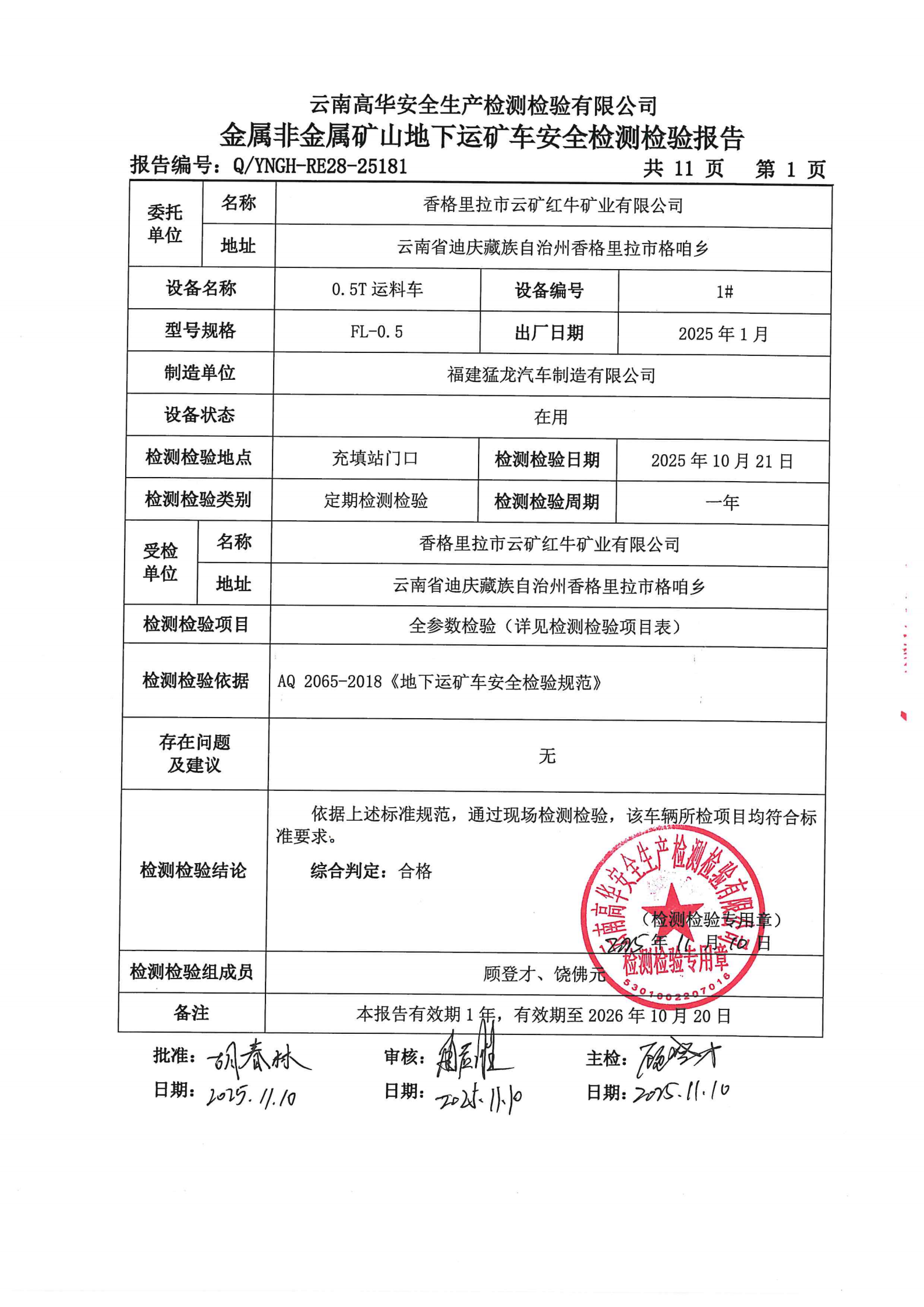 金属非金属矿山地下运矿车安全检测检验报告