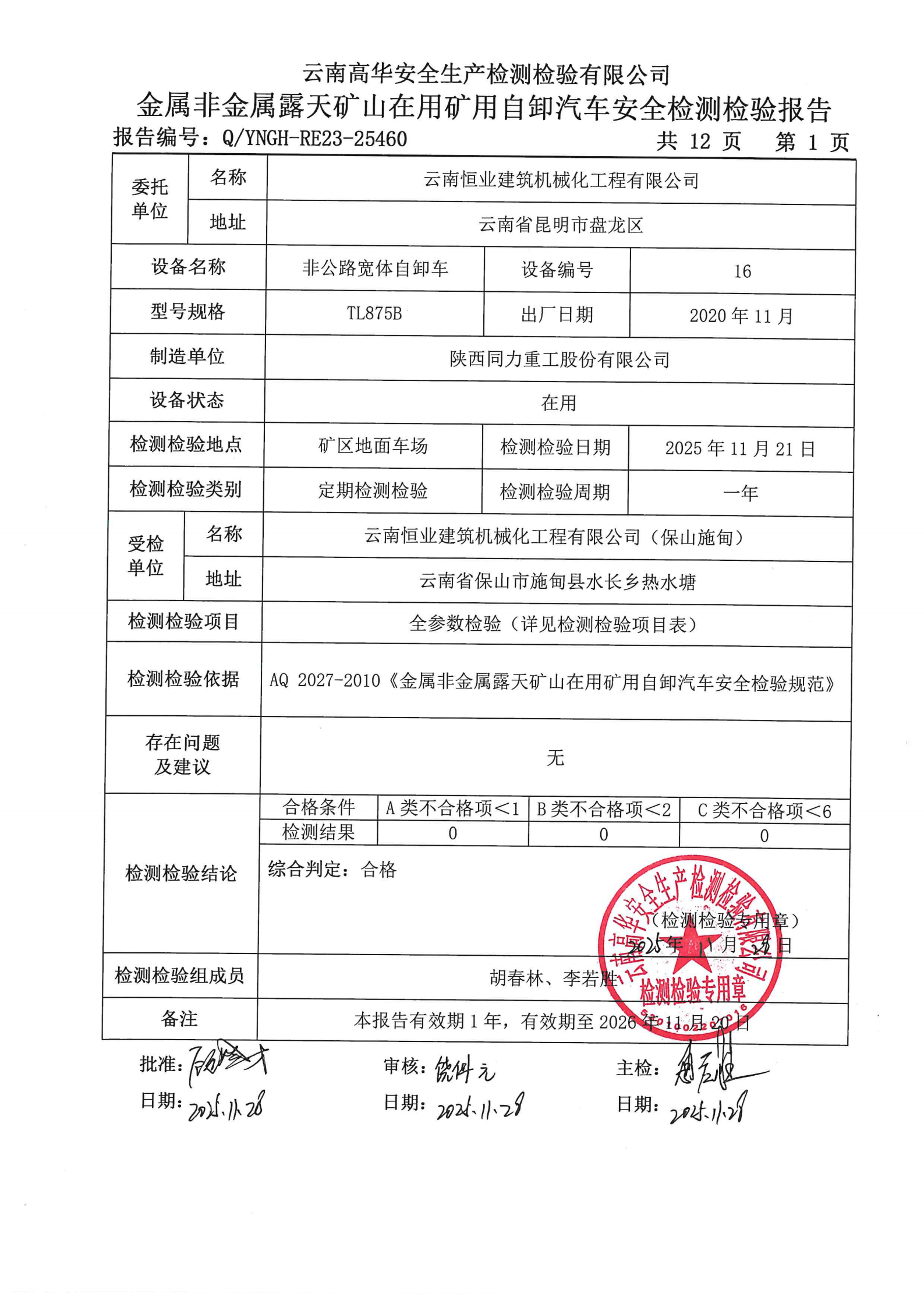 金属非金属露天矿山在用矿用自卸汽车安全检测检验报告