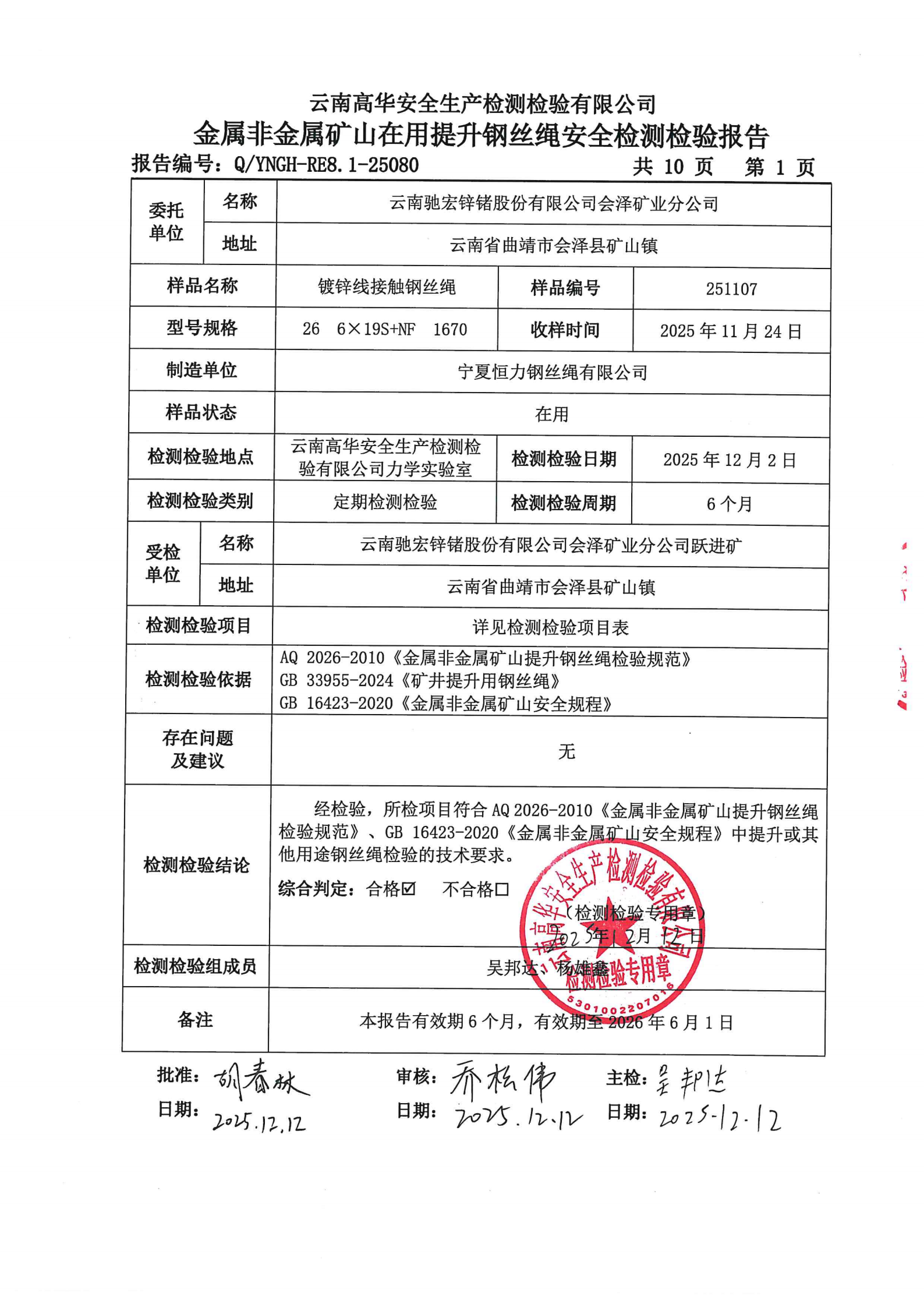金属非金属矿山在用提升钢丝绳安全检测检验报告