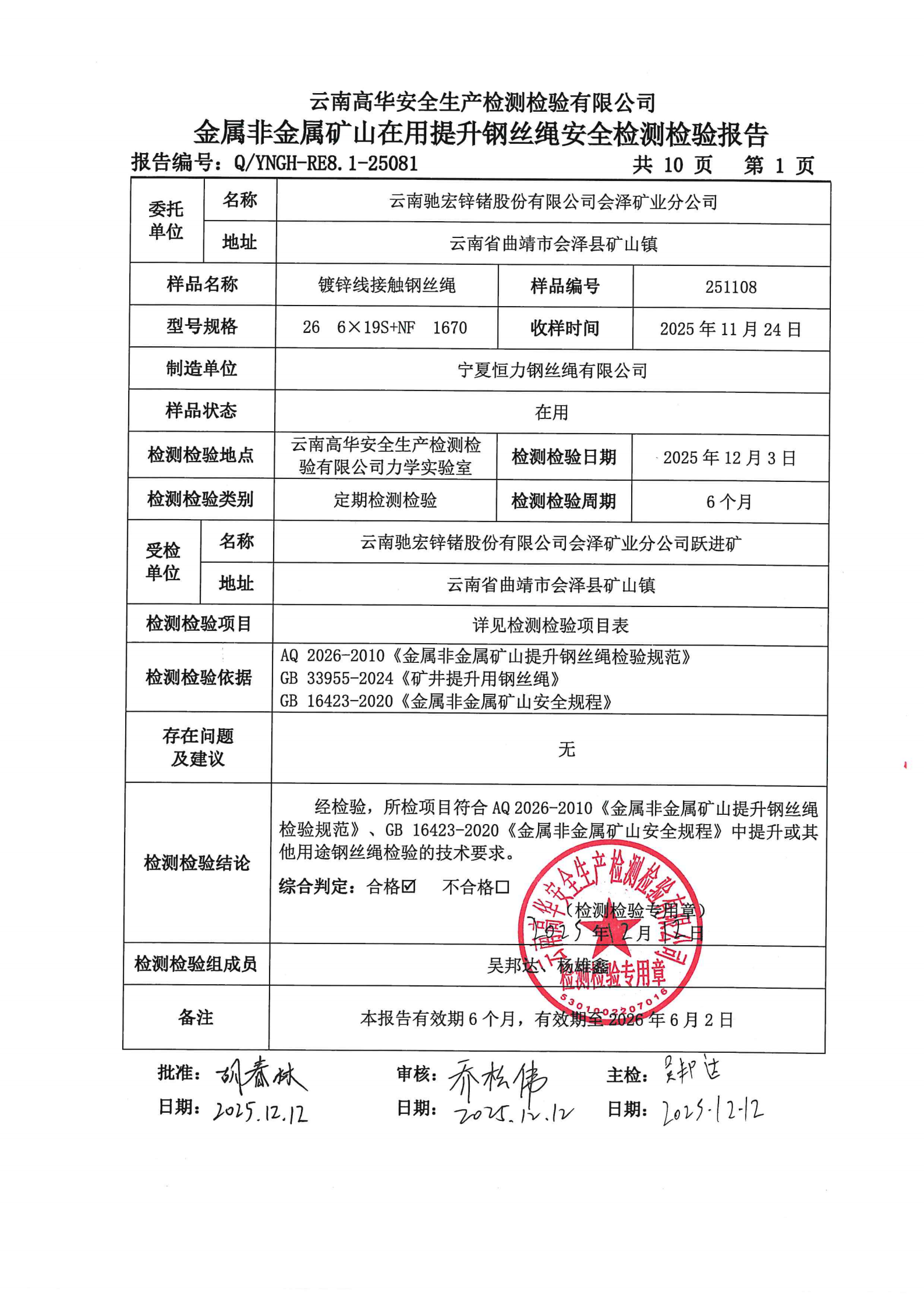 金属非金属矿山在用提升钢丝绳安全检测检验报告