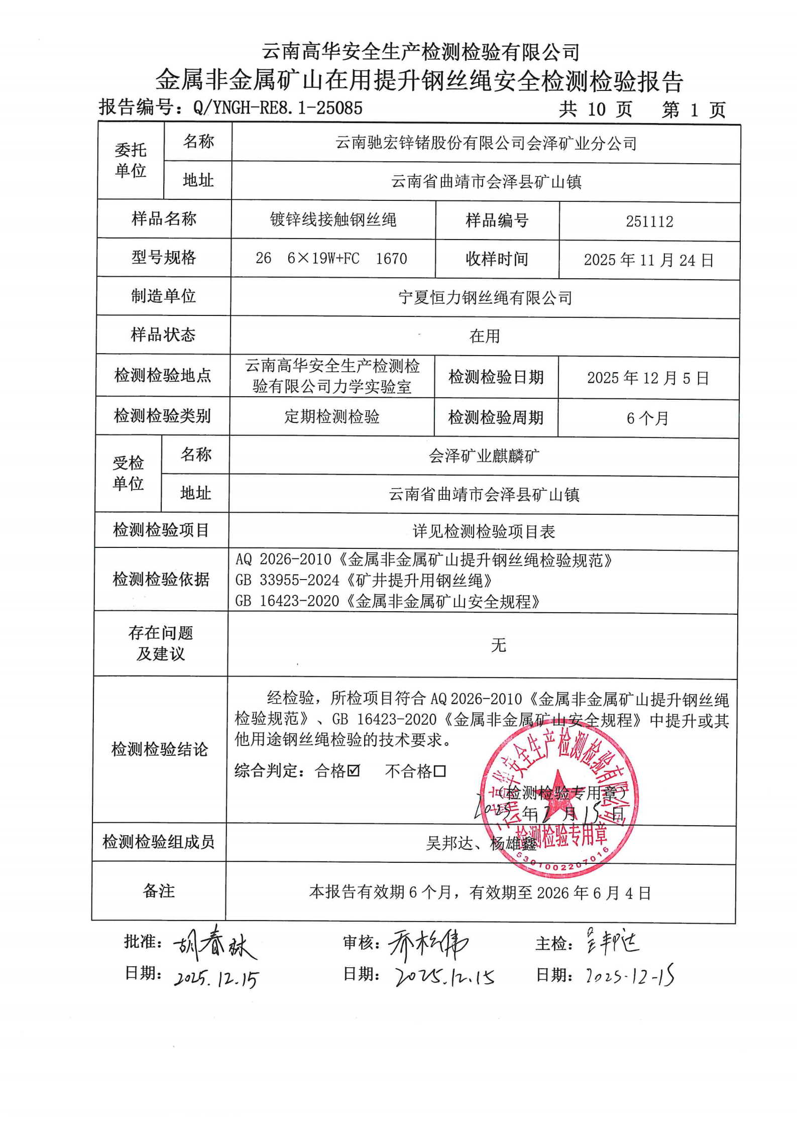 金属非金属矿山在用提升钢丝绳安全检测检验报告