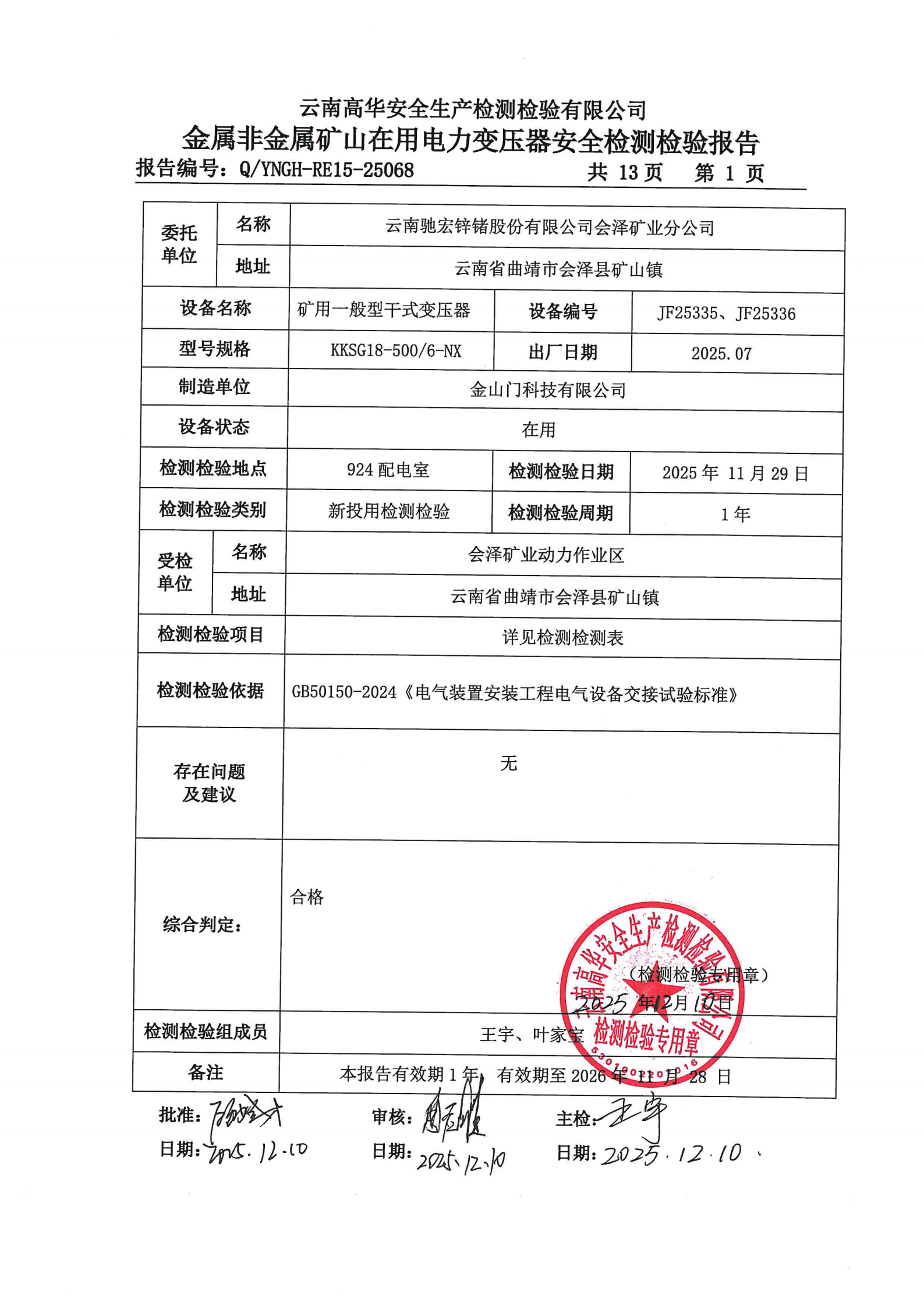 金属非金属矿山在用电力变压器安全检测检验报告