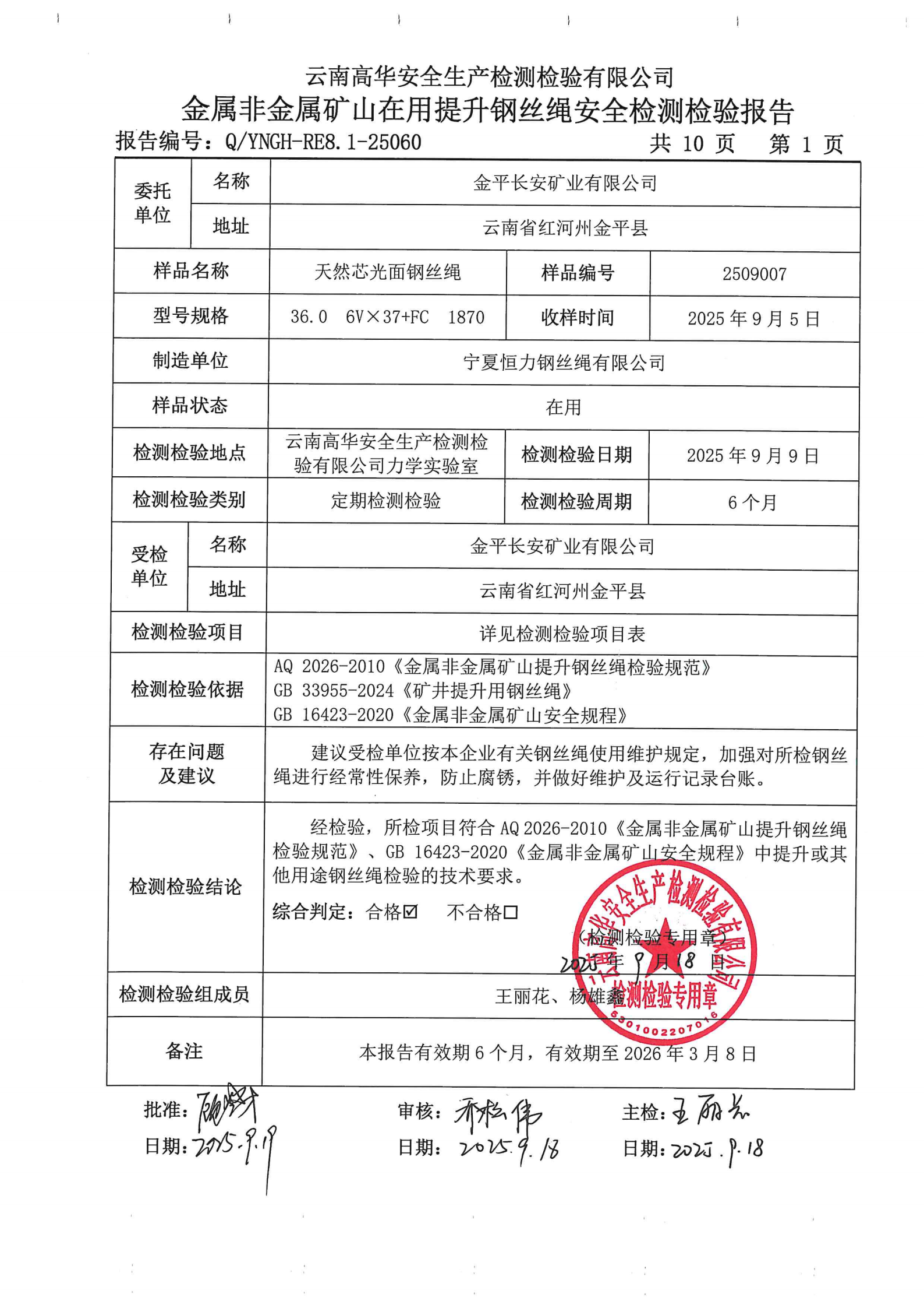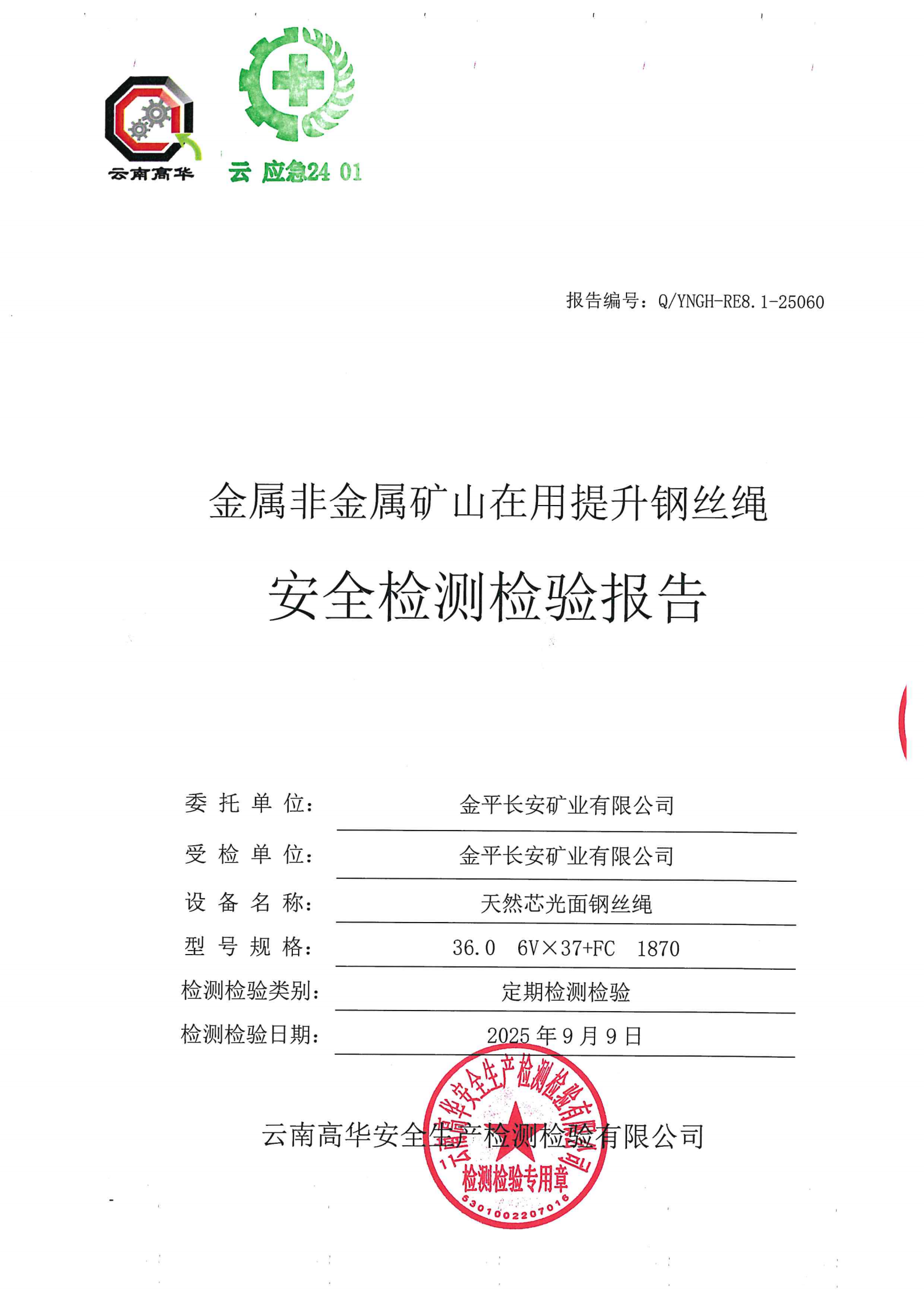 金属非金属矿山在用提升钢丝绳安全检测检验报告