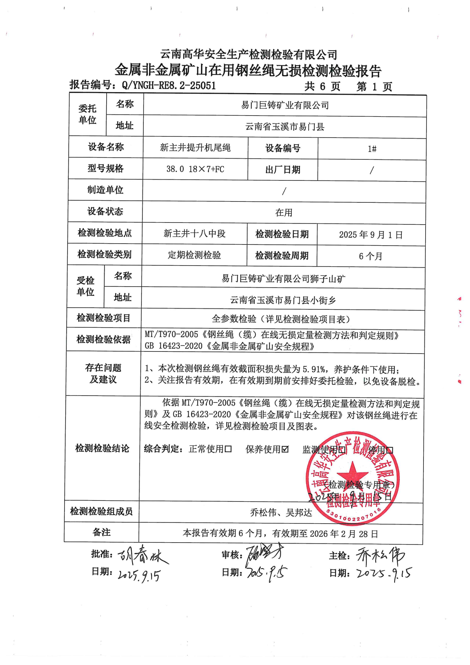 金属非金属矿山在用钢丝绳无损检测检验报告