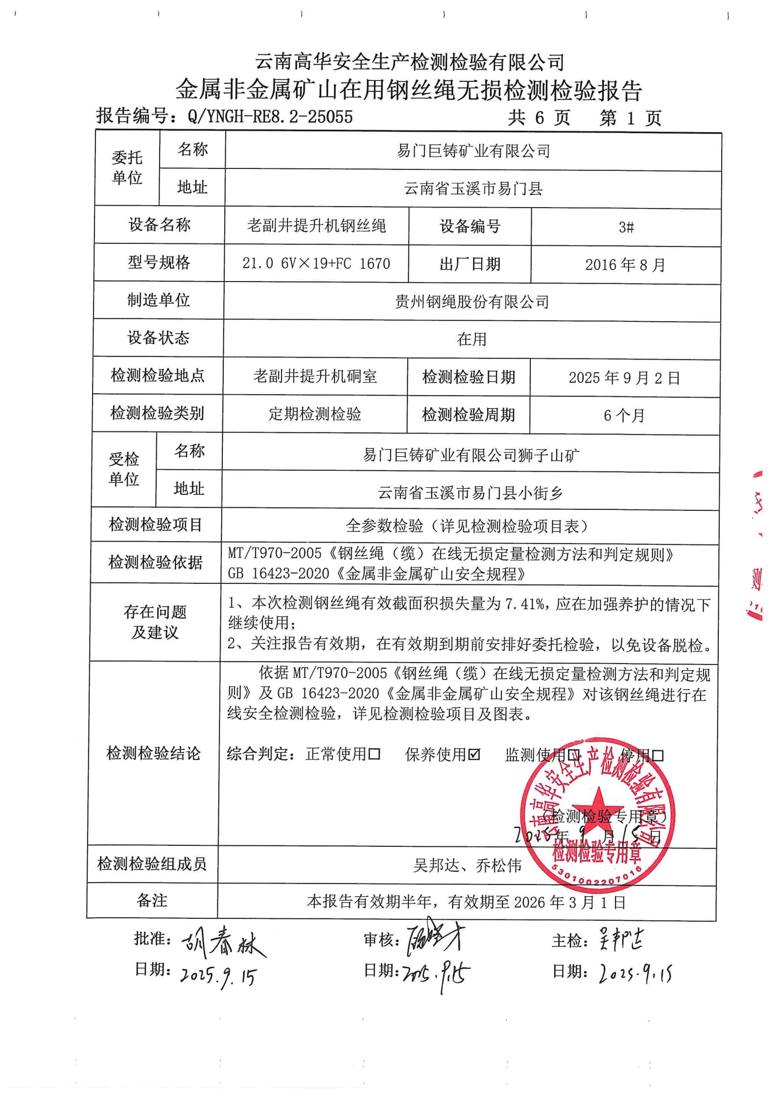 金属非金属矿山在用钢丝绳无损检测检验报告