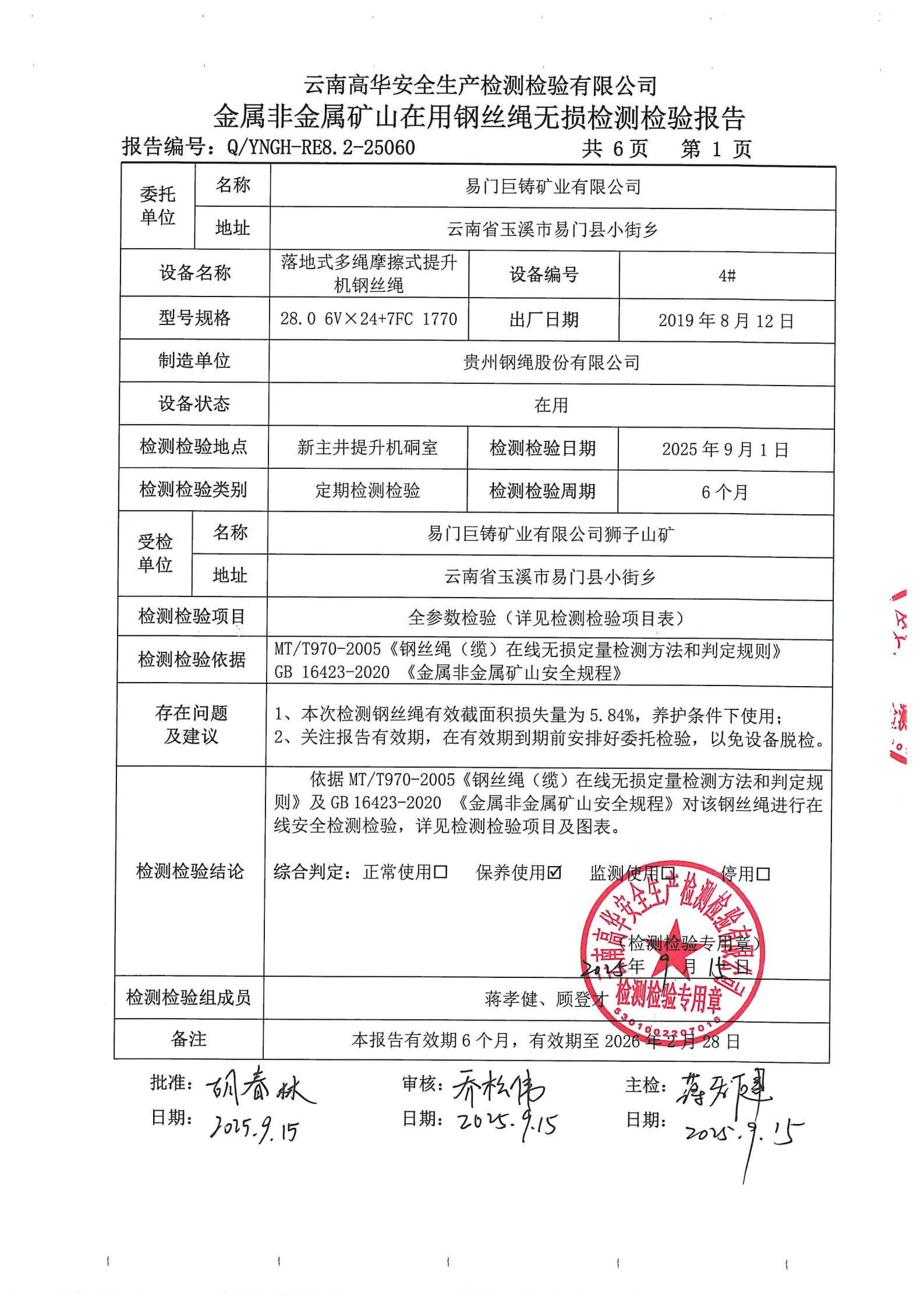 金属非金属矿山在用提升钢丝绳安全检测检验报告