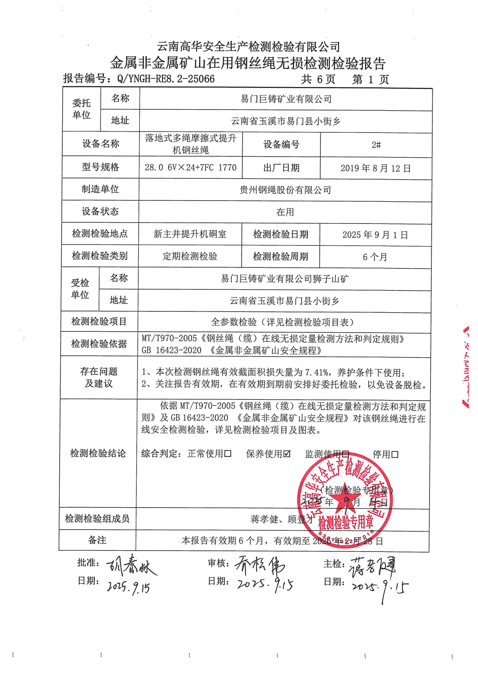 金属非金属矿山在用提升钢丝绳安全检测检验报告
