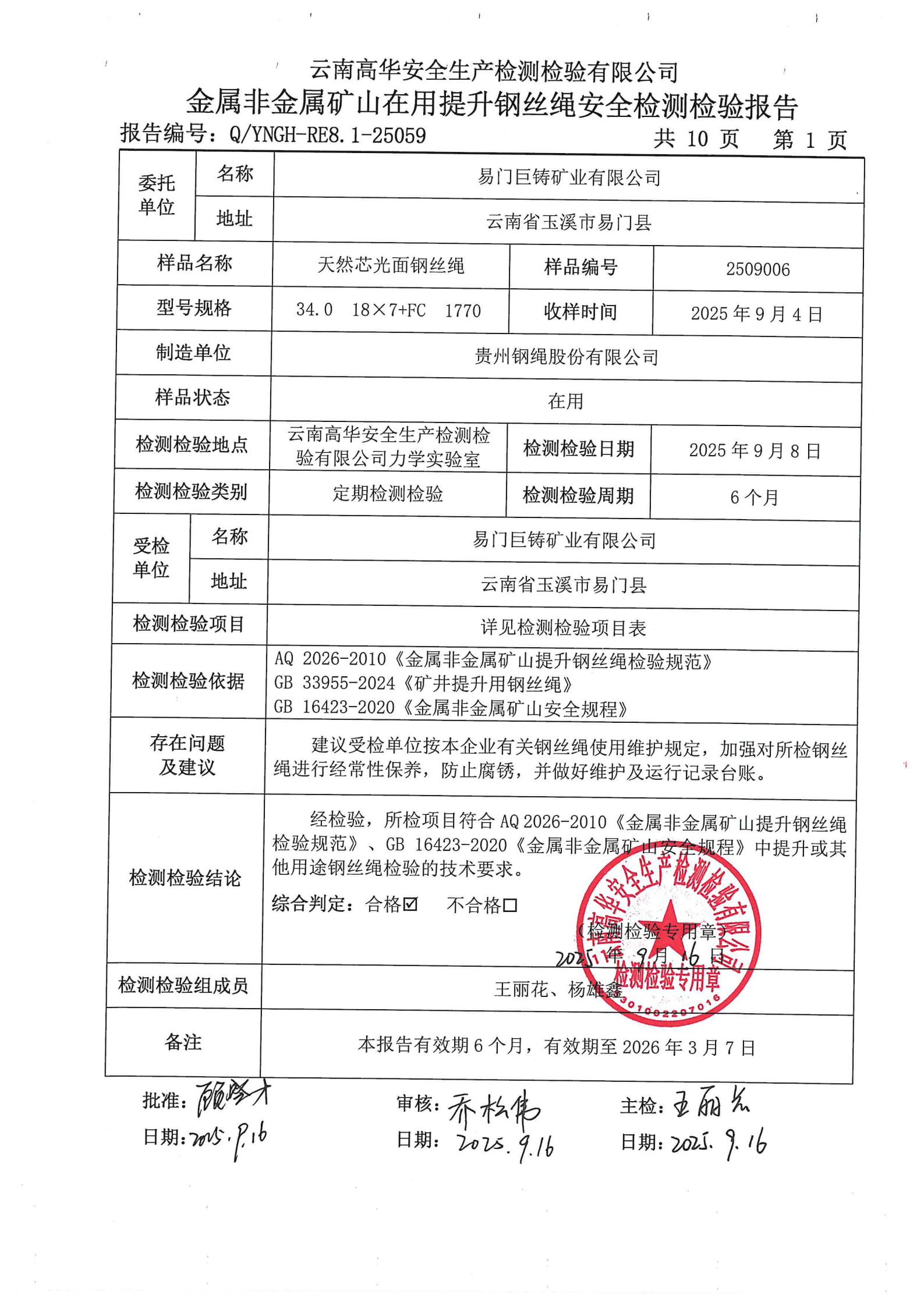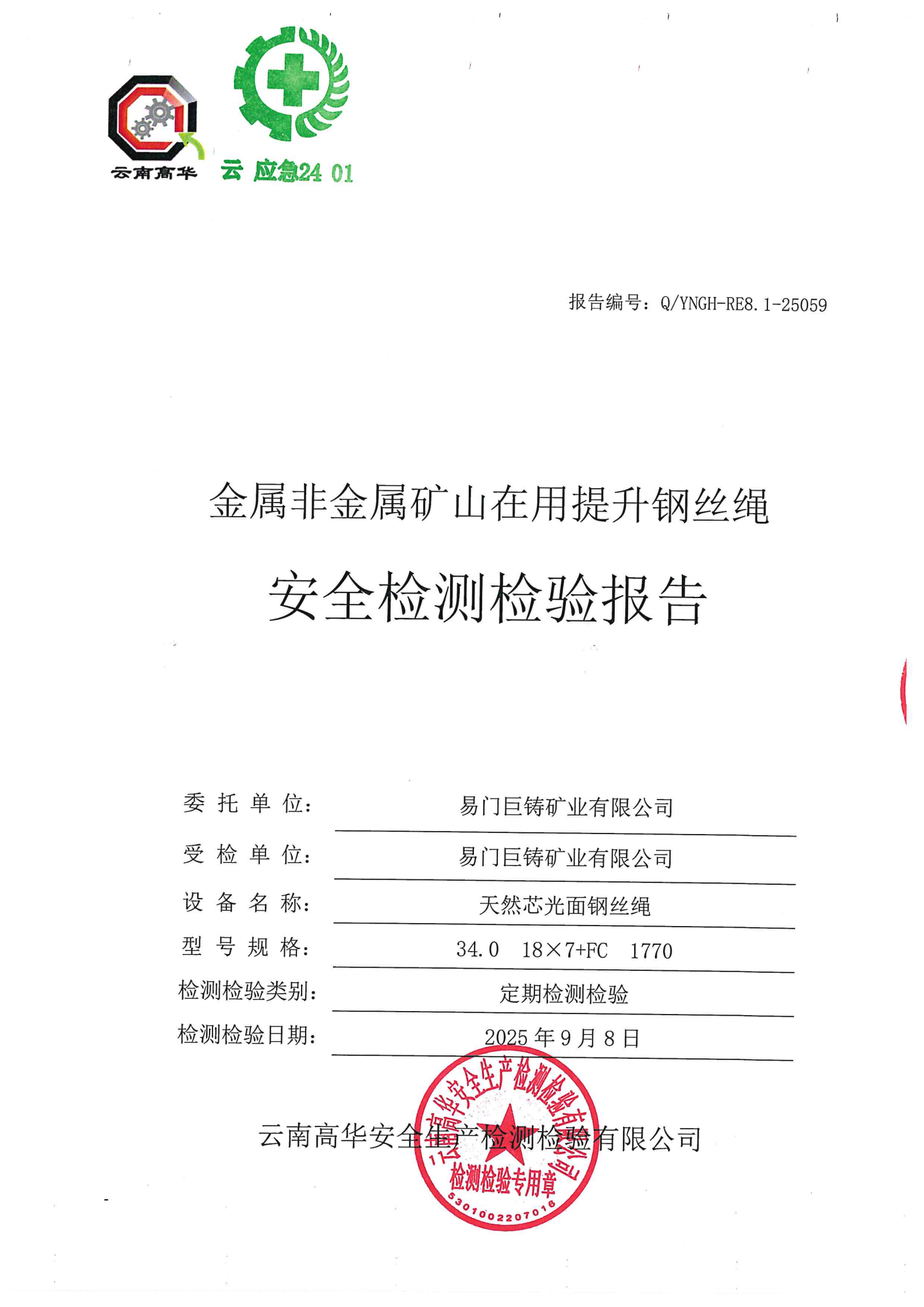 金属非金属矿山在用提升钢丝绳安全检测检验报告