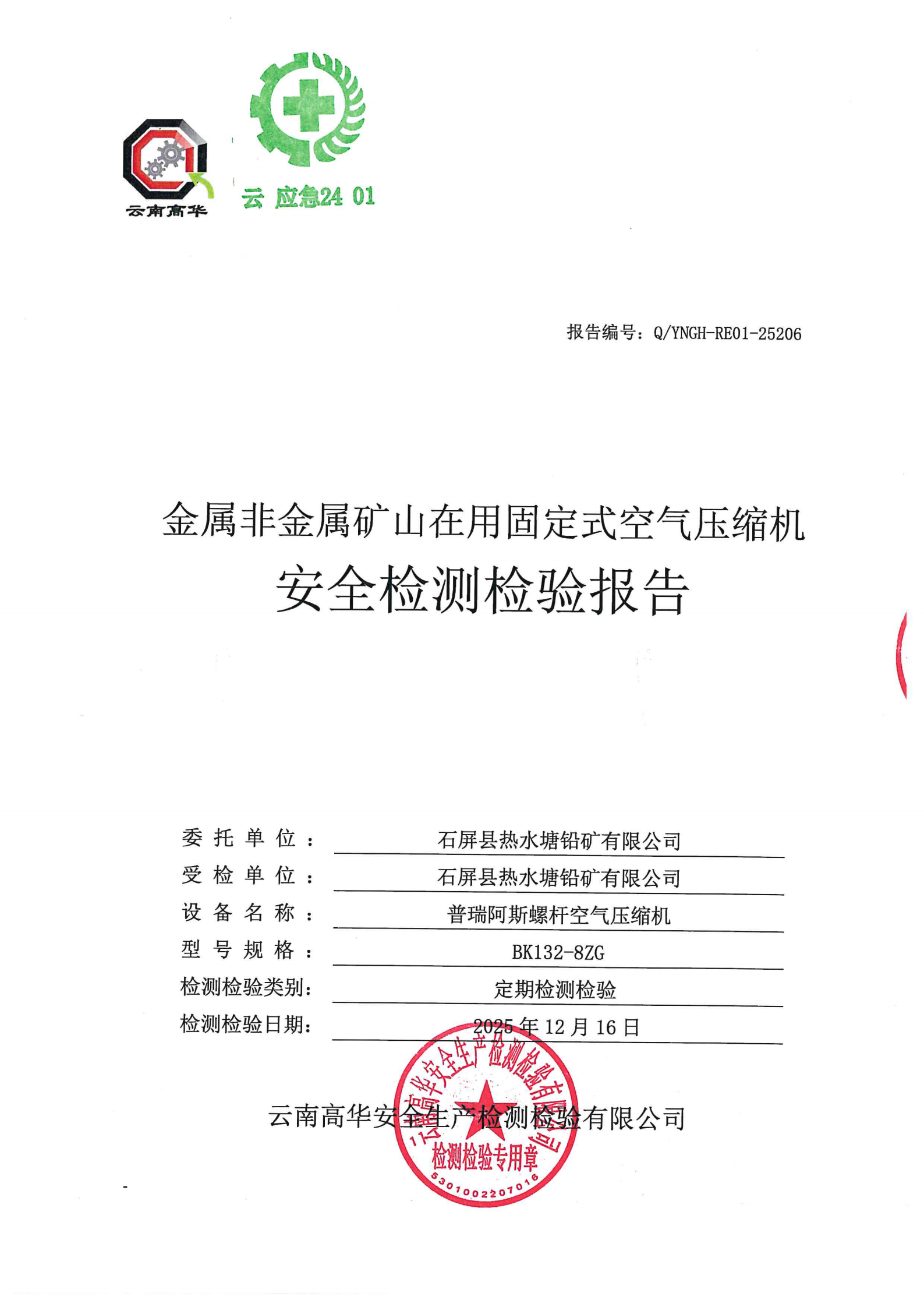金属非金属矿山在用固定式空气压缩机安全检测检验报告