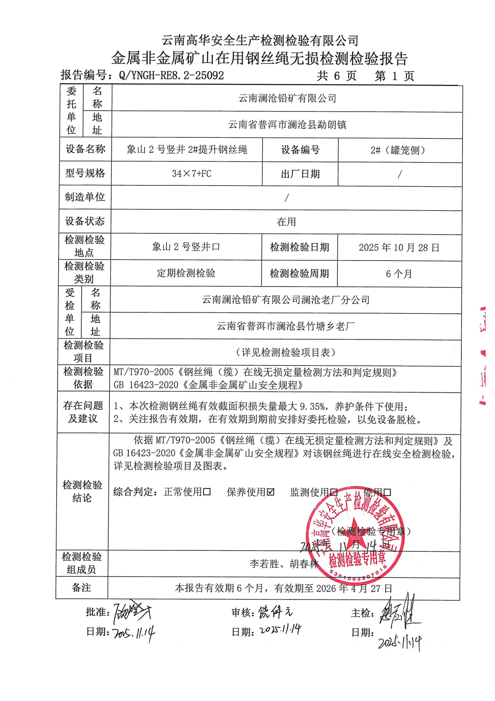 金属非金属矿山在用钢丝绳无损检测检验报告