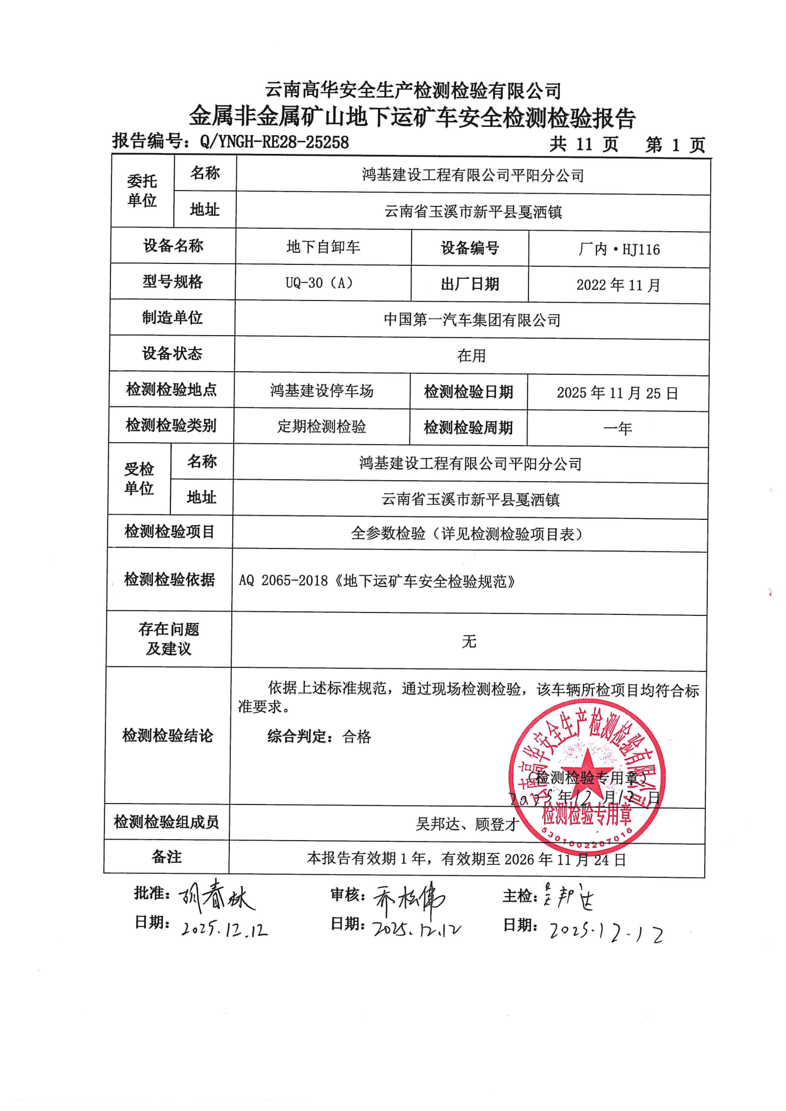 金属非金属矿山在用矿用自卸汽车安全检测检验报告