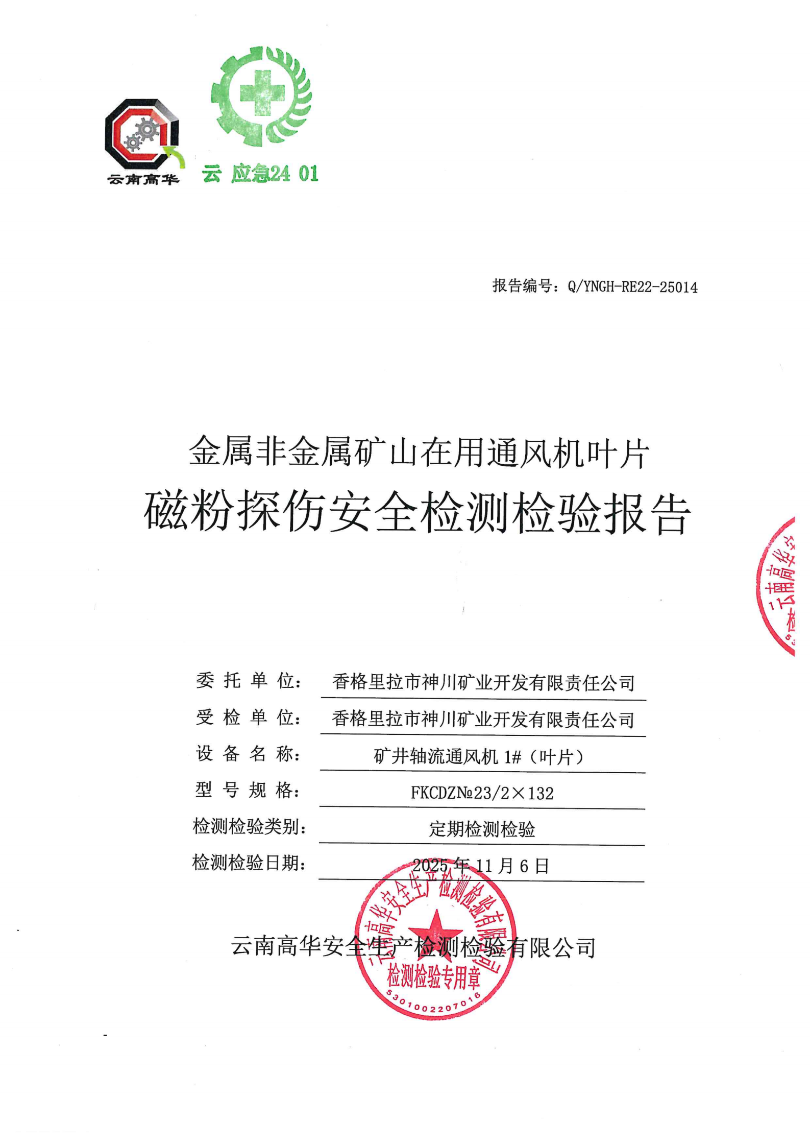 金属非金属矿山在用通风机叶片磁粉探伤安全检测检验报告