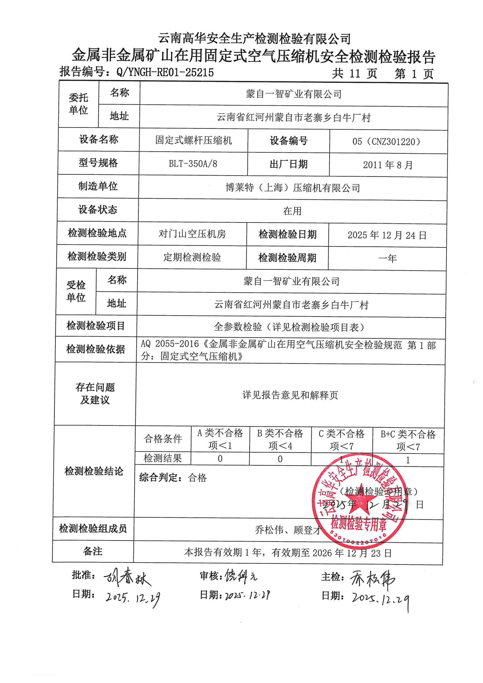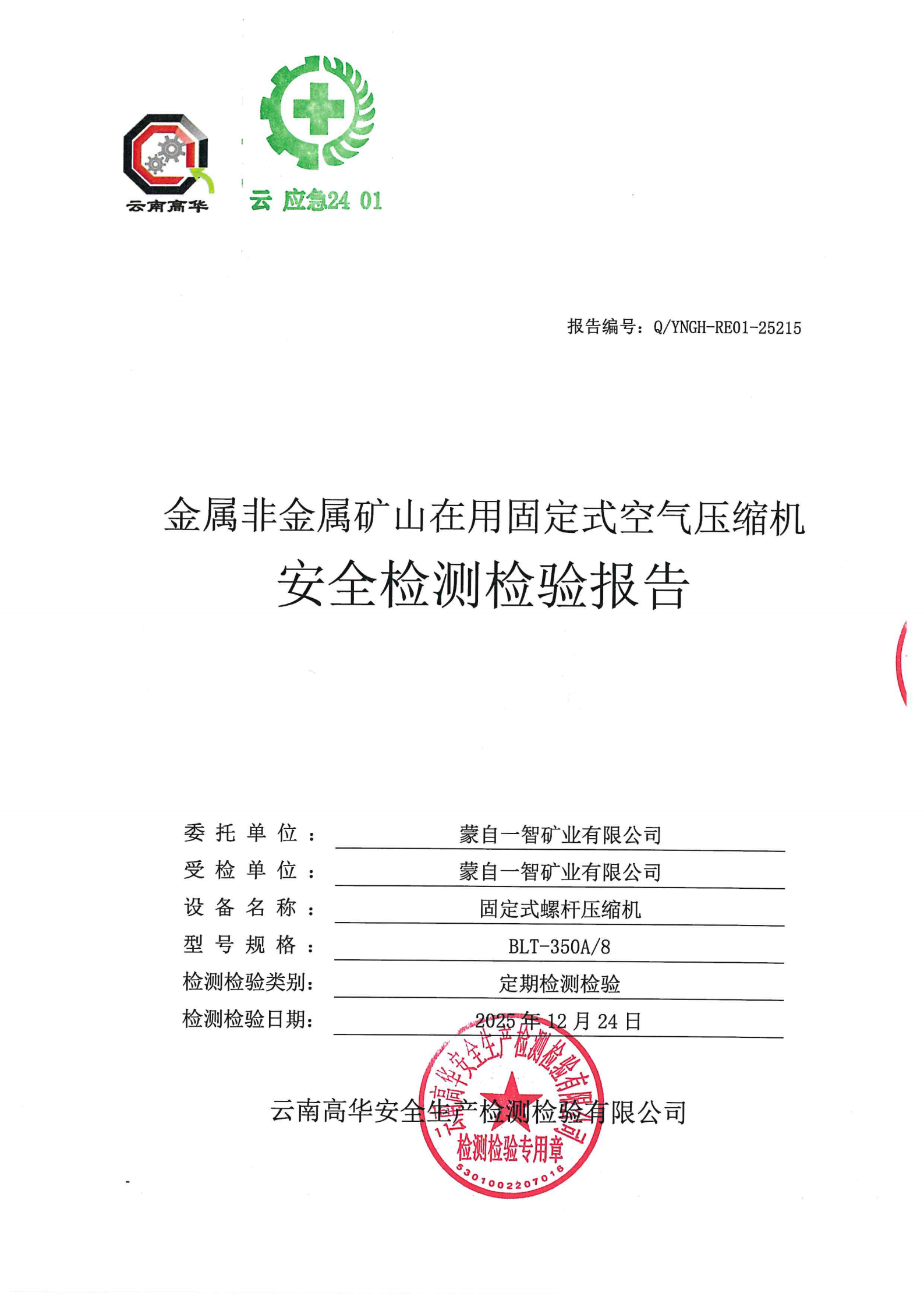 金属非金属矿山在用固定式空气压缩机安全检测检验报告