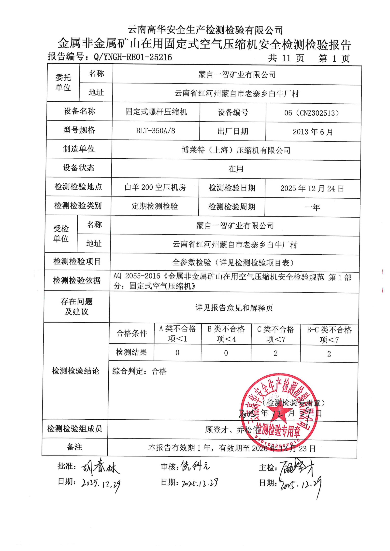 金属非金属矿山在用固定式空气压缩机安全检测检验报告
