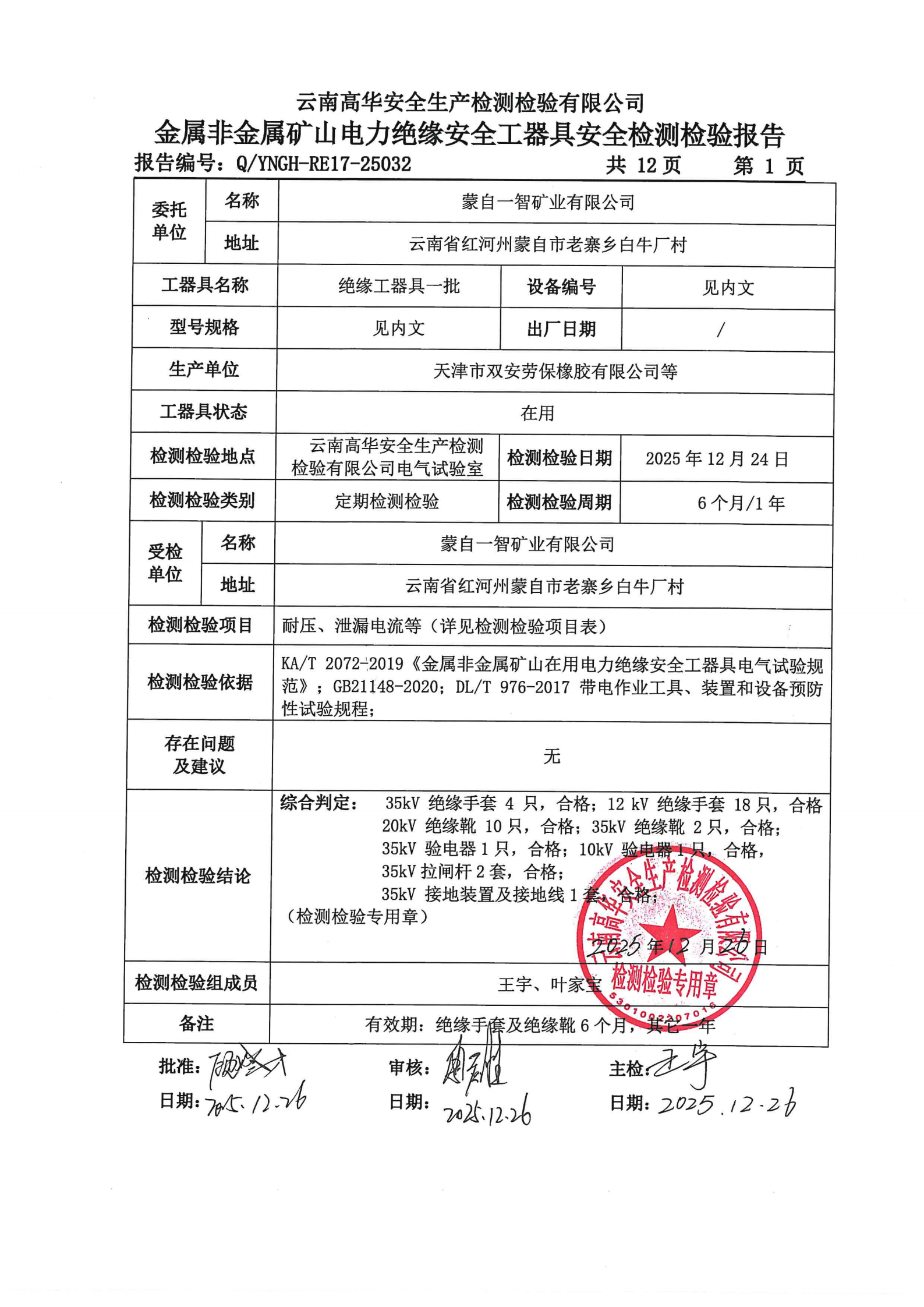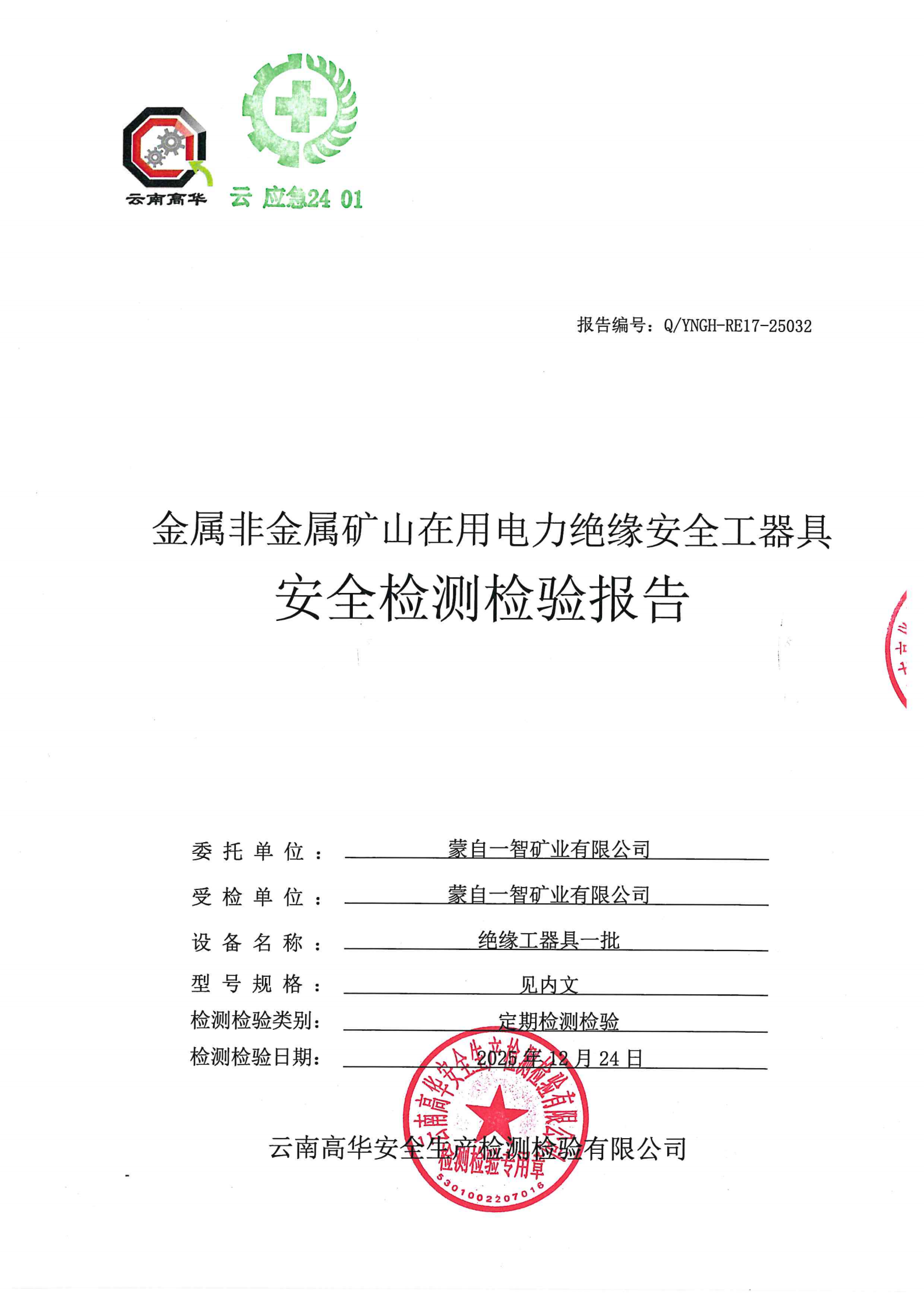 金属非金属矿山在用电力绝缘安全工器具安全检测检验报告