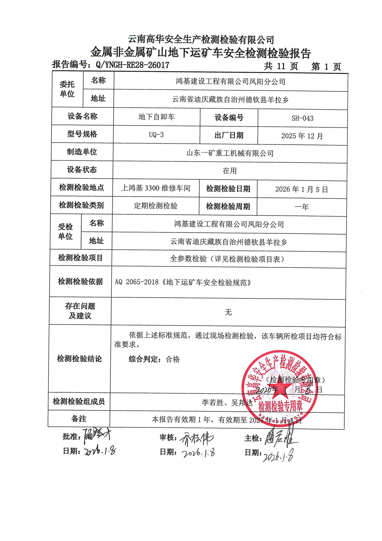 金属非金属矿山地下运矿车安全检测检验报告