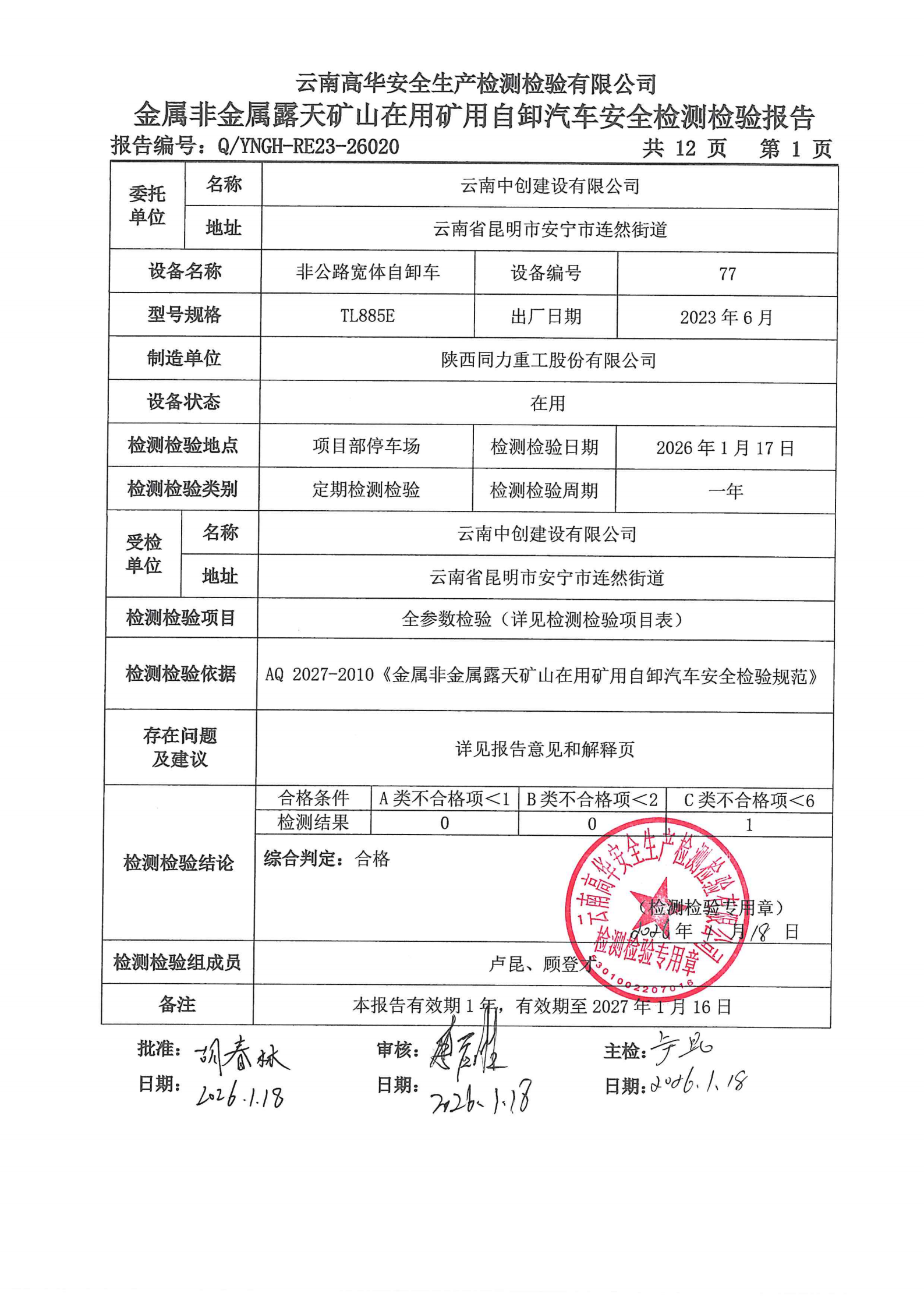 金属非金属露天矿山在用矿用自卸汽车安全检测检验报告