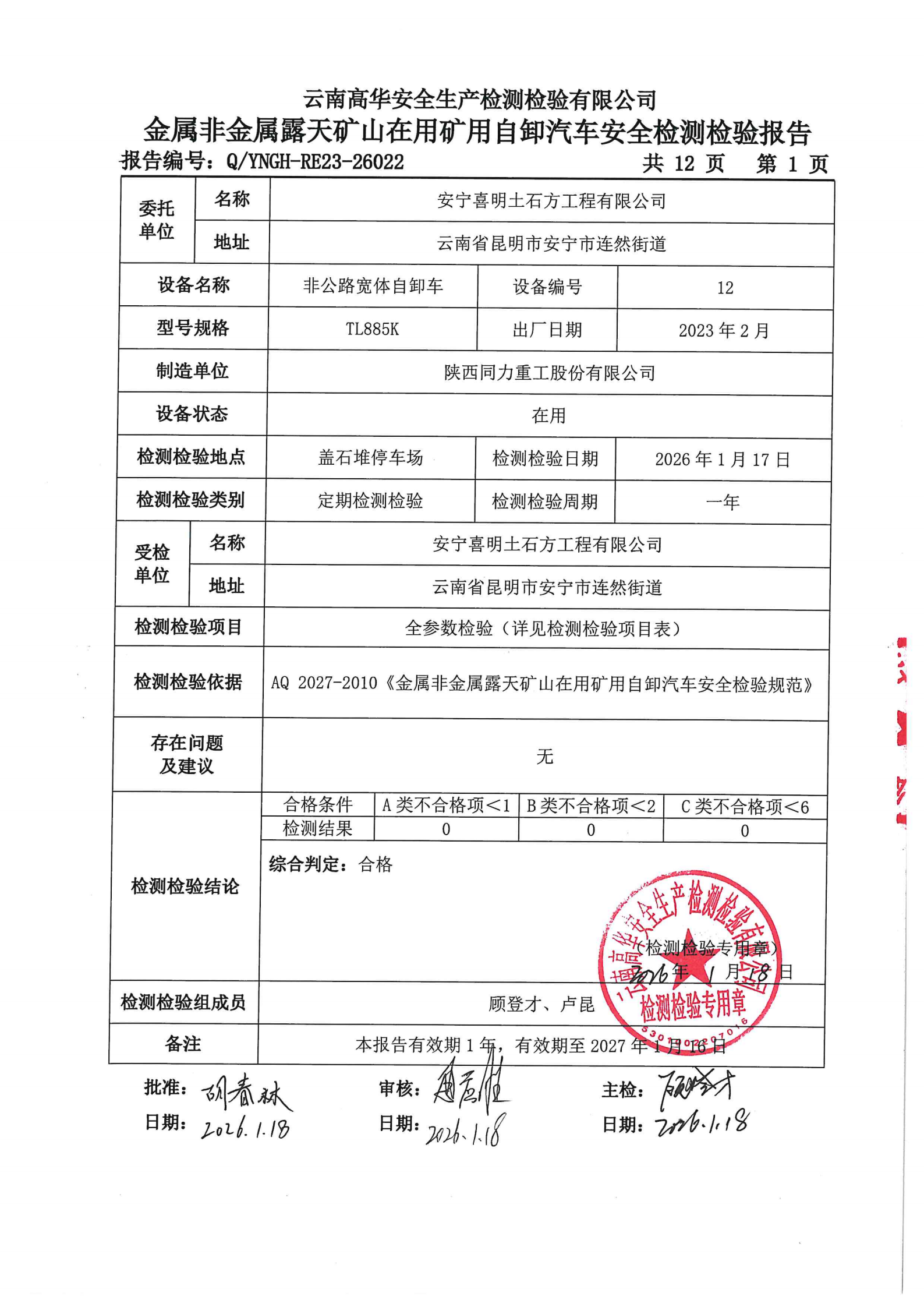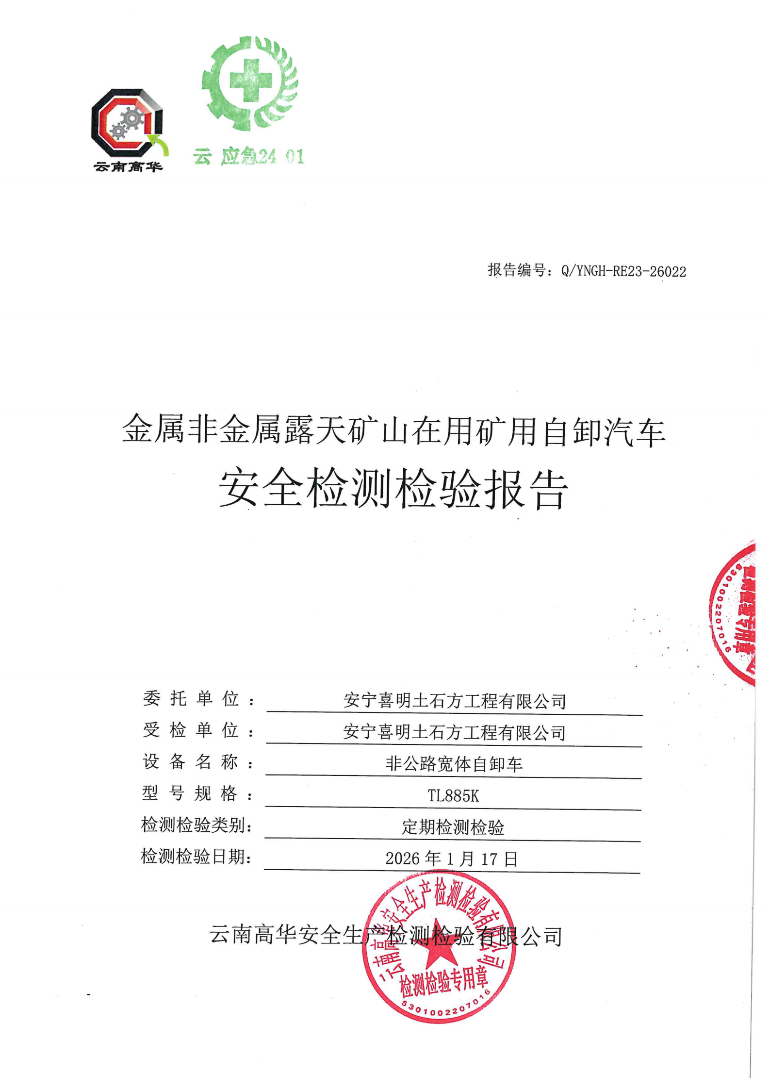 金属非金属露天矿山在用矿用自卸汽车安全检测检验报告